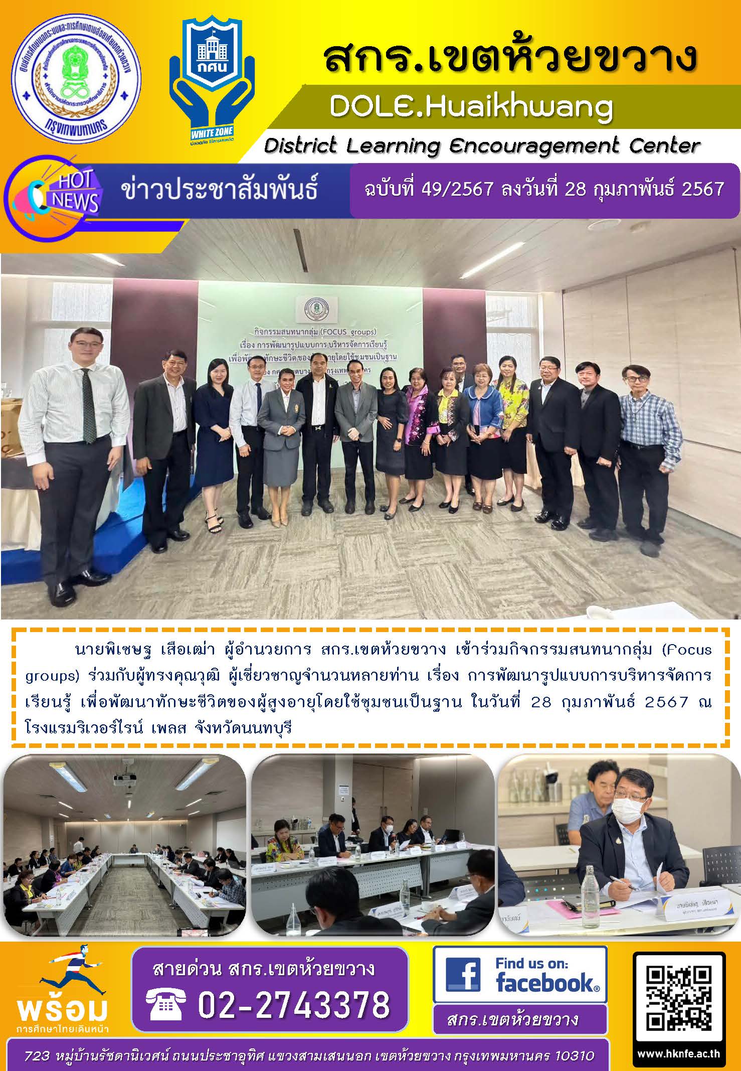 นายพิเชษฐ เสือเฒ่า ผู้อำนวยการ สกร.เขตห้วยขวาง เข้าร่วมกิจกรรมสนทนากลุ่ม (Focus groups) ร่วมกับผู้ทรงคุณวุฒิ ผู้เชี่ยวชาญจำนวนหลายท่าน เรื่อง การพัฒนารูปแบบการบริหารจัดการเรียนรู้ เพื่อพัฒนาทักษะชีวิตของผู้สูงอายุโดยใช้ชุมชนเป็นฐาน ในวันที่ 28 กุมภาพันธ์ 2567 ณ โรงแรมริเวอร์ไรน์ เพลส จังหวัดนนทบุรี