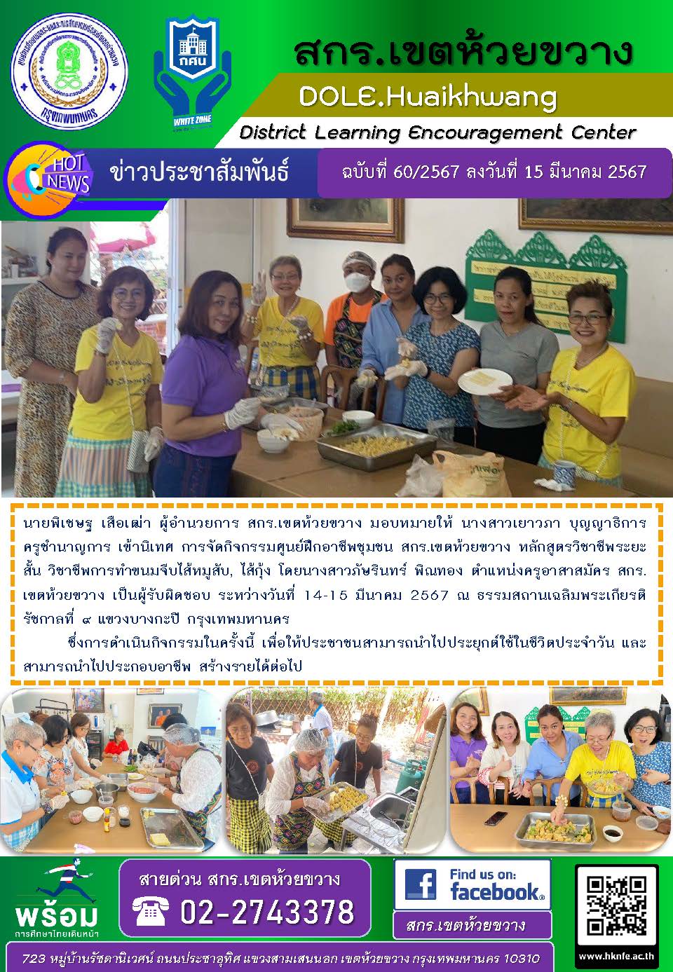 นายพิเชษฐ เสือเฒ่า ผู้อำนวยการ สกร.เขตห้วยขวาง มอบหมายให้ นางสาวเยาวภา บุญญาธิการ ครูชำนาญการ เข้านิเทศ การจัดกิจกรรมศูนย์ฝึกอาชีพชุมชน สกร.เขตห้วยขวาง หลักสูตรวิชาชีพระยะสั้น วิชาชีพการทำขนมจีบไส้หมูสับ, ไส้กุ้ง โดยนางสาวภัษรินทร์ พิณทอง ตำแหน่งครูอาสาสมัคร สกร.เขตห้วยขวาง เป็นผู้รับผิดชอบ ระหว่างวันที่ 14-15 มีนาคม 2567 ณ ธรรมสถานเฉลิมพระเกียรติรัชกาลที่ ๙ แขวงบางกะปิ กรุงเทพมหานคร