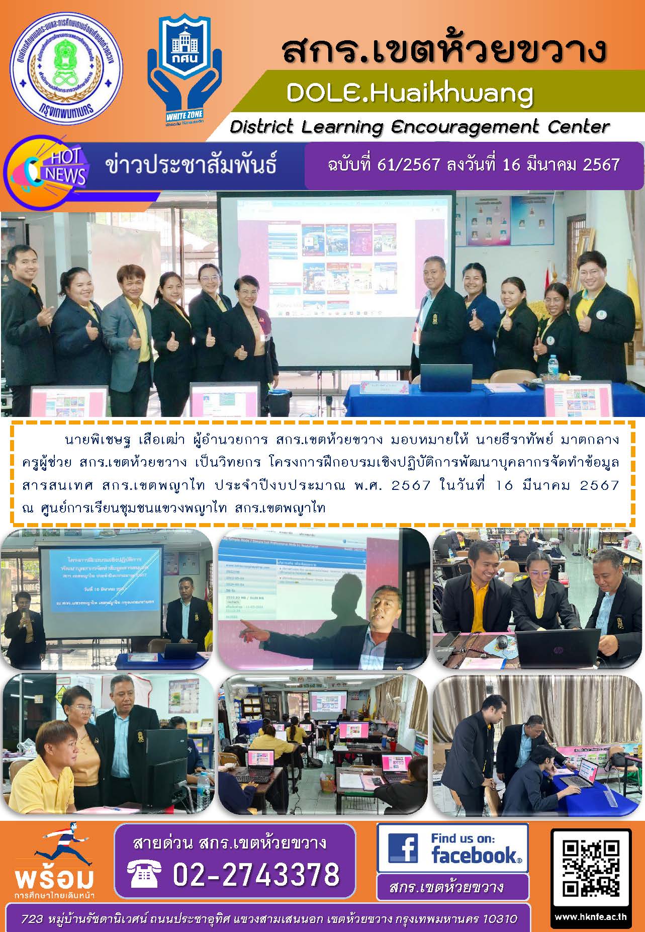 นายพิเชษฐ เสือเฒ่า ผู้อำนวยการ สกร.เขตห้วยขวาง มอบหมายให้ นายธีราทัพย์ มาตกลาง ครูผู้ช่วย สกร.เขตห้วยขวาง เป็นวิทยกร โครงการฝึกอบรมเชิงปฏิบัติการพัฒนาบุคลากรจัดทำข้อมูลสารสนเทศ สกร.เขตพญาไท ประจำปีงบประมาณ พ.ศ. 2567 ในวันที่ 16 มีนาคม 2567 ณ ห้องประชุม สกร.เขตพญาไท