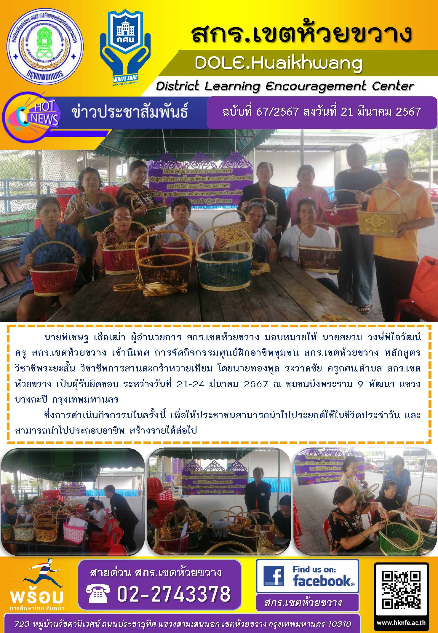 นายพิเชษฐ เสือเฒ่า ผู้อำนวยการ สกร.เขตห้วยขวาง มอบหมายให้ นายสยาม วงษ์พิไลวัฒน์ ครู สกร.เขตห้วยขวาง เข้านิเทศ การจัดกิจกรรมศูนย์ฝึกอาชีพชุมชน สกร.เขตห้วยขวาง หลักสูตรวิชาชีพระยะสั้น วิชาชีพการสานตะกร้าหวายเทียม โดยนายทองพูล ระวาดชัย ครูกศน.ตำบล สกร.เขตห้วยขวาง เป็นผู้รับผิดชอบ ระหว่างวันที่ 21-24 มีนาคม 2567 ณ ชุมชนบึงพระราม 9 พัฒนา แขวงบางกะปิ กรุงเทพมหานคร