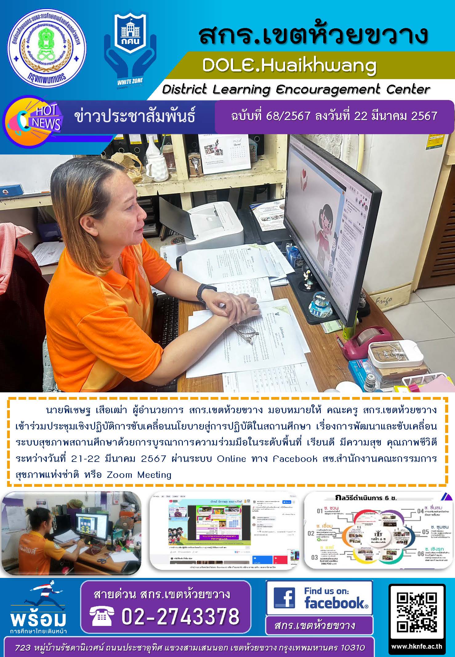 นายพิเชษฐ เสือเฒ่า ผู้อำนวยการ สกร.เขตห้วยขวาง มอบหมายให้ คณะครู สกร.เขตห้วยขวาง เข้าร่วมประชุมเชิงปฏิบัติการขับเคลื่อนนโยบายสู่การปฏิบัติในสถานศึกษา เรื่องการพัฒนาและขับเคลื่อนระบบสุขภาพสถานศึกษาด้วยการบูรณาการความร่วมมือในระดับพื้นที่ เรียนดี มีความสุข คุณภาพชีวิตี ระหว่างวันที่ 21-22 มีนาคม 2567 ผ่านระบบ Online ทาง Facebook Live สช.สำนักงานคณะกรรมการสุขภาพแห่งช่าติ หรือ Zoom Meeting