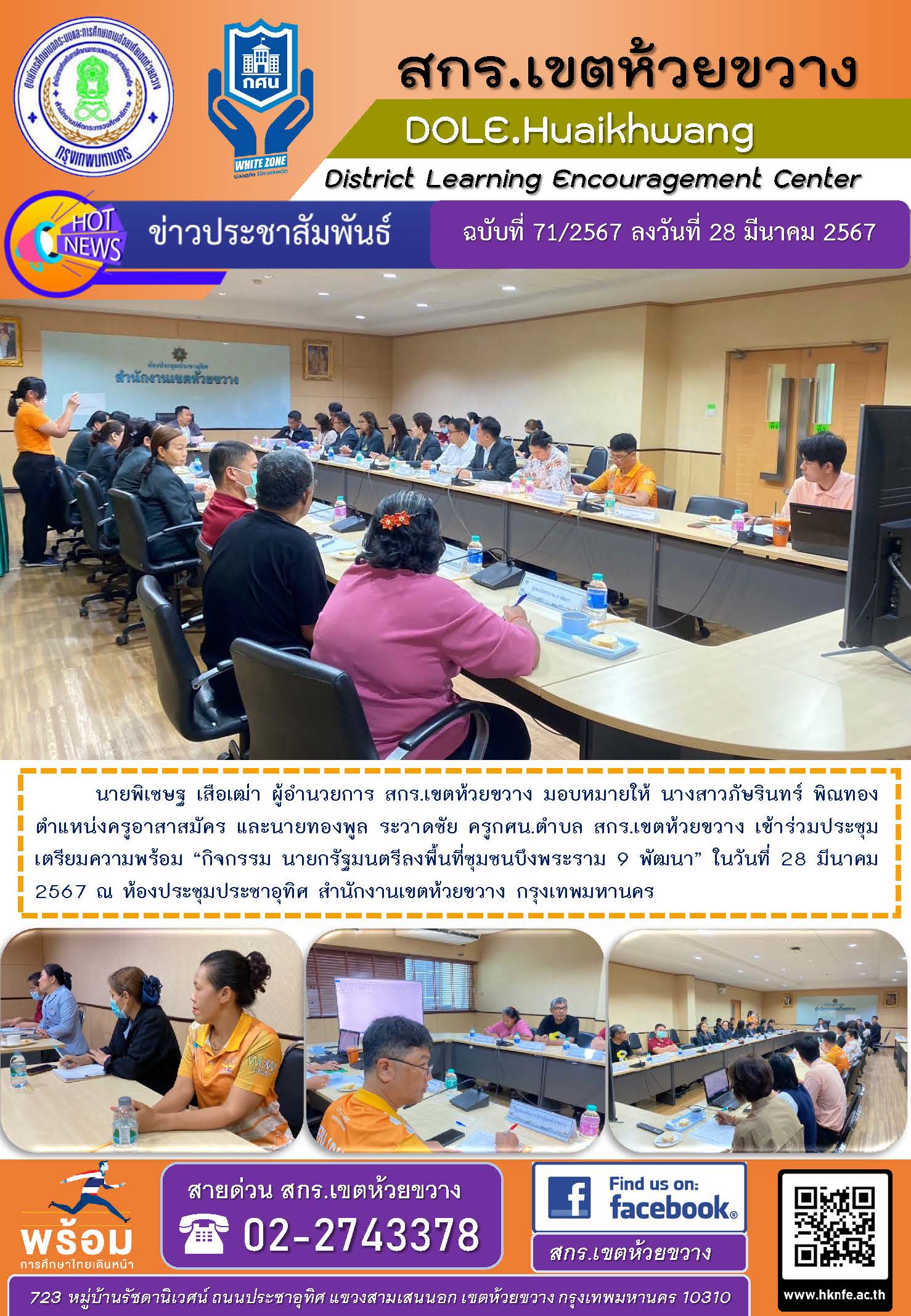 นายพิเชษฐ เสือเฒ่า ผู้อำนวยการ สกร.เขตห้วยขวาง มอบหมายให้ นางสาวภัษรินทร์ พิณทอง ตำแหน่งครูอาสาสมัคร และนายทองพูล ระวาดชัย ครูกศน.ตำบล สกร.เขตห้วยขวาง เข้าร่วมประชุมเตรียมความพร้อม “กิจกรรม นายกรัฐมนตรีลงพื้นที่ชุมชนบึงพระราม 9 พัฒนา” ในวันที่ 28 มีนาคม 2567 ณ ห้องประชุมประชาอุทิศ สำนักงานเขตห้วยขวาง กรุงเทพมหานคร