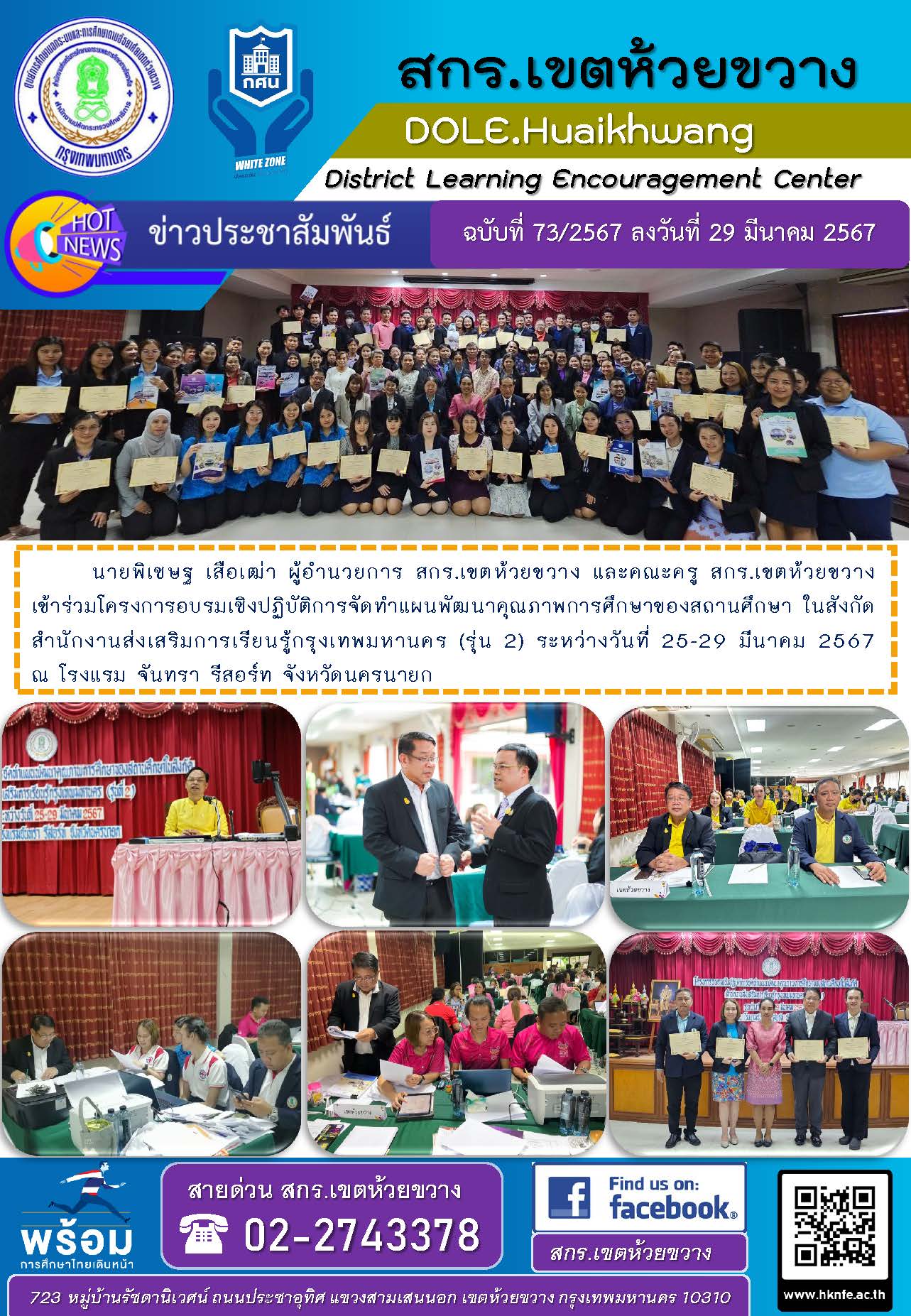นายพิเชษฐ เสือเฒ่า ผู้อำนวยการ สกร.เขตห้วยขวาง และคณะครู สกร.เขตห้วยขวาง เข้าร่วมโครงการอบรมเชิงปฏิบัติการจัดทำแผนพัฒนาคุณภาพการศึกษาของสถานศึกษา ในสังกัด สำนักงานส่งเสริมการเรียนรู้กรุงเทพมหานคร (รุ่น 2) ระหว่างวันที่ 25-29 มีนาคม 2567 ณ โรงแรม จันทรา รีสอร์ท จังหวัดนครนายก