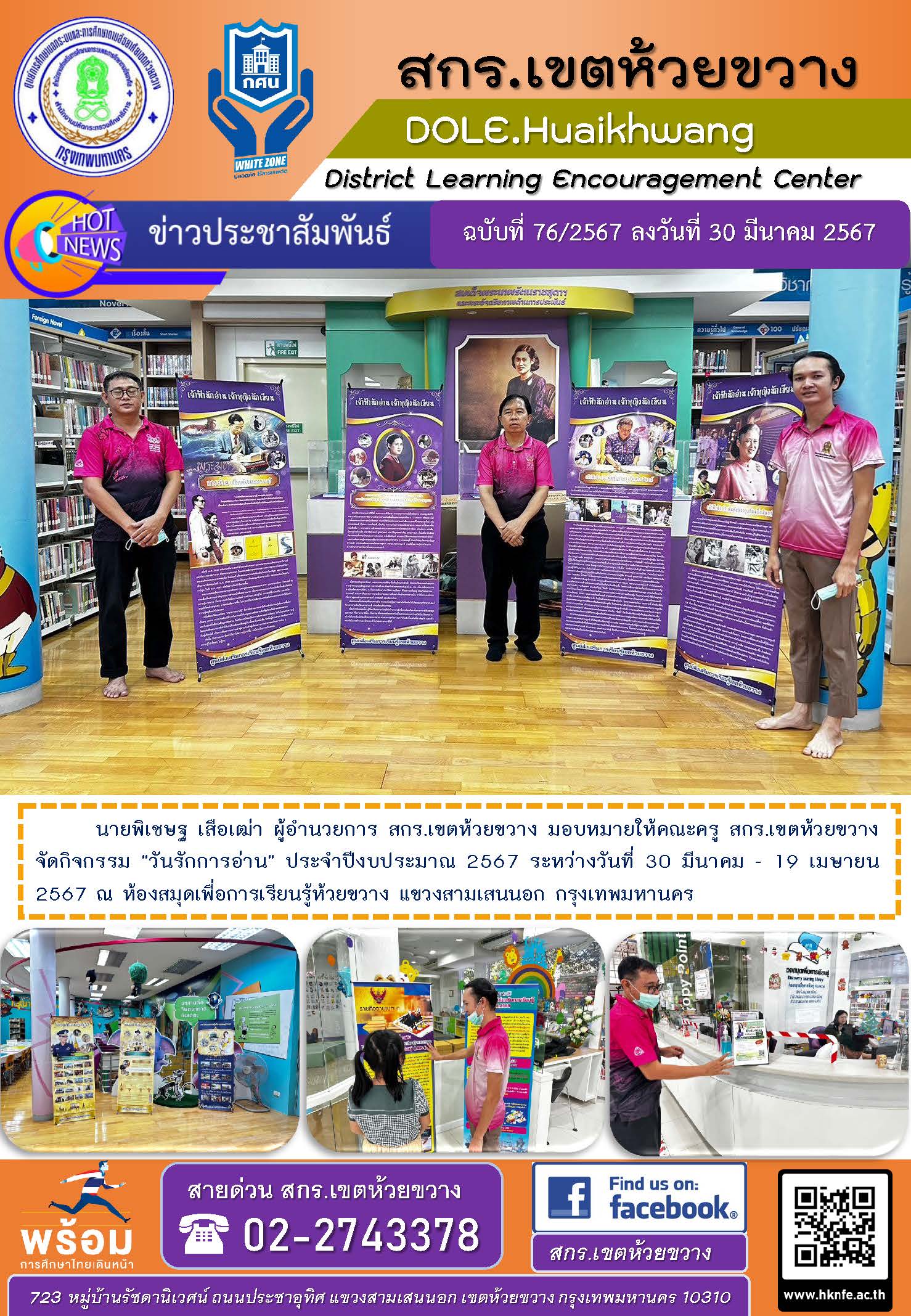 นายพิเชษฐ เสือเฒ่า ผู้อำนวยการ สกร.เขตห้วยขวาง มอบหมายให้คณะครู สกร.เขตห้วยขวาง จัดกิจกรรม "วันรักการอ่าน" ประจำปีงบประมาณ 2567 ระหว่างวันที่ 30 มีนาคม – 19 เมษายน 2567 ณ ห้องสมุดเพื่อการเรียนรู้ห้วยขวาง แขวงสามเสนนอก กรุงเทพมหานคร