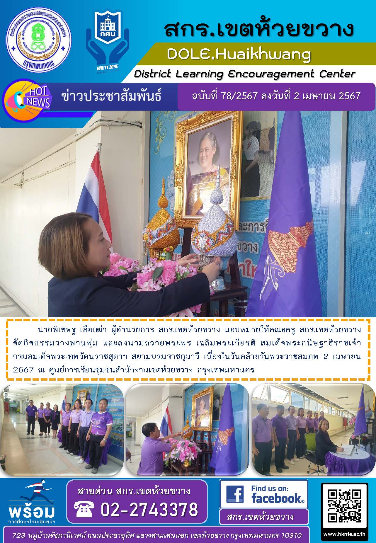 นายพิเชษฐ เสือเฒ่า ผู้อำนวยการ สกร.เขตห้วยขวาง มอบหมายให้คณะครู สกร.เขตห้วยขวาง จัดกิจกรรมวางพานพุ่ม และลงนามถวายพระพร เฉลิมพระเกียรติ สมเด็จพระกนิษฐาธิราชเจ้า กรมสมเด็จพระเทพรัตนราชสุดาฯ สยามบรมราชกุมารี เนื่องในวันคล้ายวันพระราชสมภพ 2 เมษายน 2567 ณ ศูนย์การเรียนชุมชนสำนักงานเขตห้วยขวาง กรุงเทพมหานคร