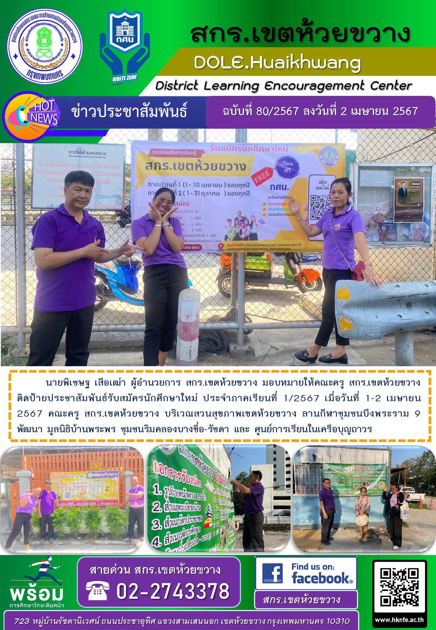 นายพิเชษฐ เสือเฒ่า ผู้อำนวยการ สกร.เขตห้วยขวาง มอบหมายให้คณะครู สกร.เขตห้วยขวาง ติดป้ายประชาสัมพันธ์รับสมัครนักศึกษาใหม่ ประจำภาคเรียนที่ 1/2567 ระหว่างวันที่ 1-2 เมษายน 2567 คณะครู สกร.เขตห้วยขวาง บริเวณสวนสุขภาพเขตห้วยขวาง ลานกีฬาชุมชนบึงพระราม 9 พัฒนา มูลนิธิบ้านพระพร ชุมชนริมคลองบางซื่อ-รัชดา และ ศูนย์การเรียนในเครือบุญถาวร