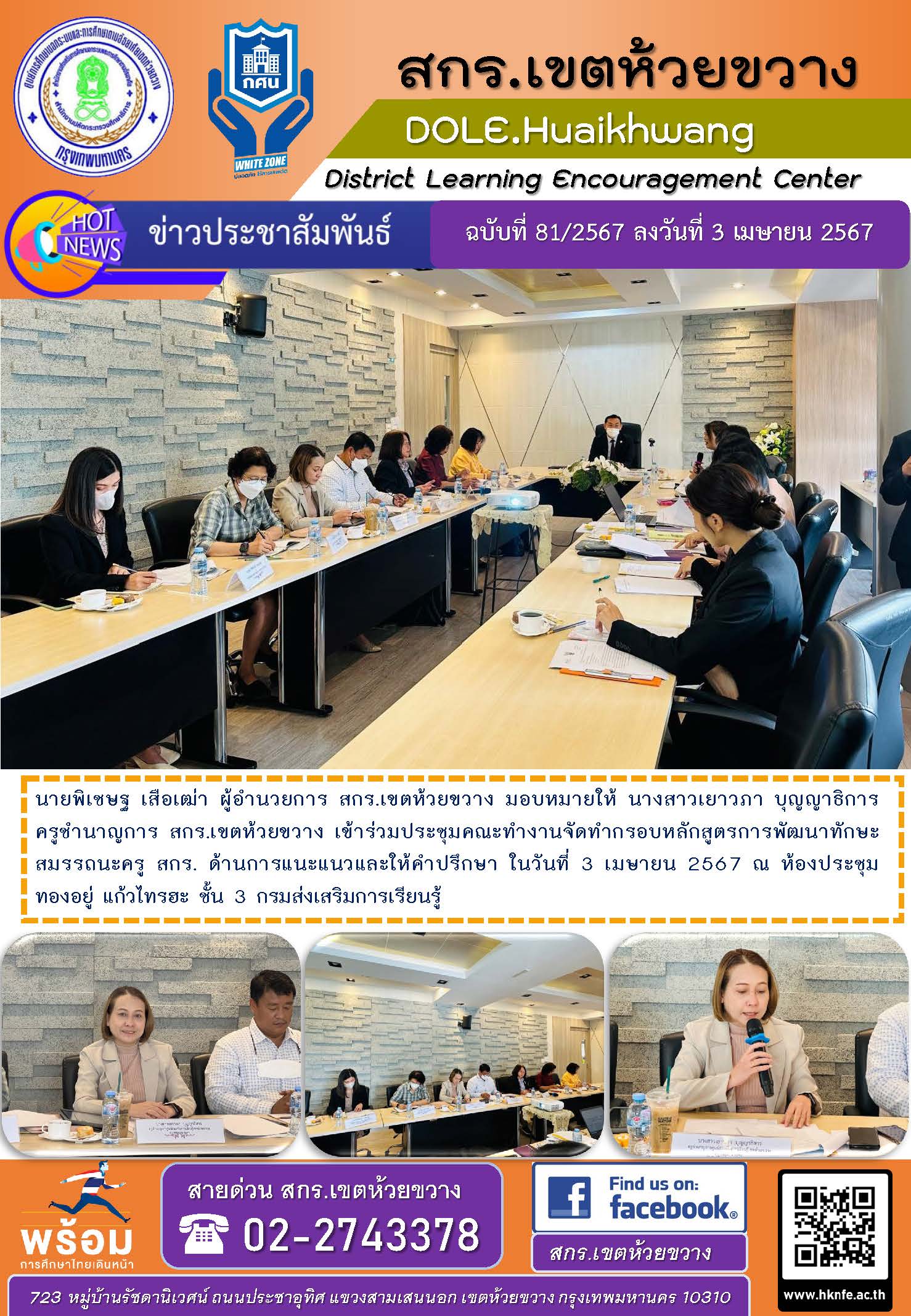 นายพิเชษฐ เสือเฒ่า ผู้อำนวยการ สกร.เขตห้วยขวาง มอบหมายให้ นางสาวเยาวภา บุญญาธิการ ครูชำนาญการ สกร.เขตห้วยขวาง เข้าร่วมประชุมคณะทำงานจัดทำกรอบหลักสูตรการพัฒนาทักษะสมรรถนะครู สกร. ด้านการแนะแนวและให้คำปรึกษา ในวันที่ 3 เมษายน 2567 ณ ห้องประชุมทองอยู่ แก้วไทรฮะ ชั้น 3 กรมส่งเสริมการเรียนรู้
