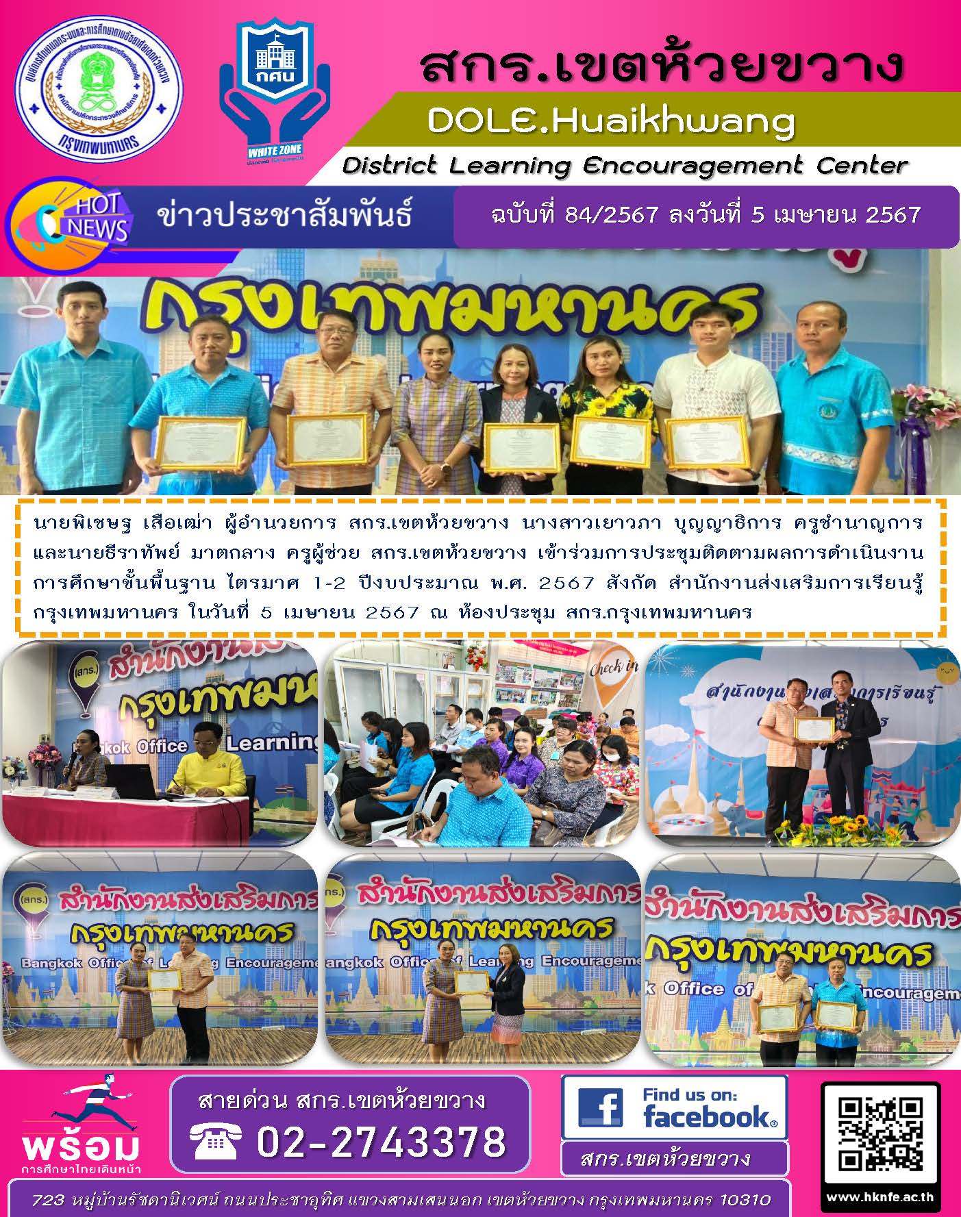 นายพิเชษฐ เสือเฒ่า ผู้อำนวยการ สกร.เขตห้วยขวาง นางสาวเยาวภา บุญญาธิการ ครูชำนาญการ และนายธีราทัพย์ มาตกลาง ครูผู้ช่วย สกร.เขตห้วยขวาง เข้าร่วมการประชุมติดตามผลการดำเนินงานการศึกษาขั้นพื้นฐาน ไตรมาศ 1-2 ปีงบประมาณ พ.ศ. 2567 สังกัด สำนักงานส่งเสริมการเรียนรู้กรุงเทพมหานคร ในวันที่ 5 เมษายน 2567 ณ ห้องประชุม สกร.กรุงเทพมหานคร