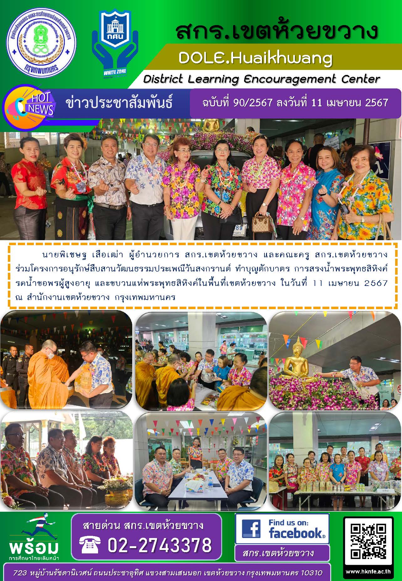 นายพิเชษฐ เสือเฒ่า ผู้อำนวยการ สกร.เขตห้วยขวาง และคณะครู สกร.เขตห้วยขวาง ร่วมโครงการอนุรักษ์สืบสานวัฒนธรรมประเพณีวันสงกรานต์ ทำบุญตักบาตร การสรงน้ำพระพุทธสิหิงค์ รดน้ำขอพรผู้สูงอายุ และขบวนแห่พระพุทธสิหิงค์ในพื้นที่เขตห้วยขวาง ในวันที่ 11 เมษายน 2567 ณ สำนักงานเขตห้วยขวาง กรุงเทพมหานคร