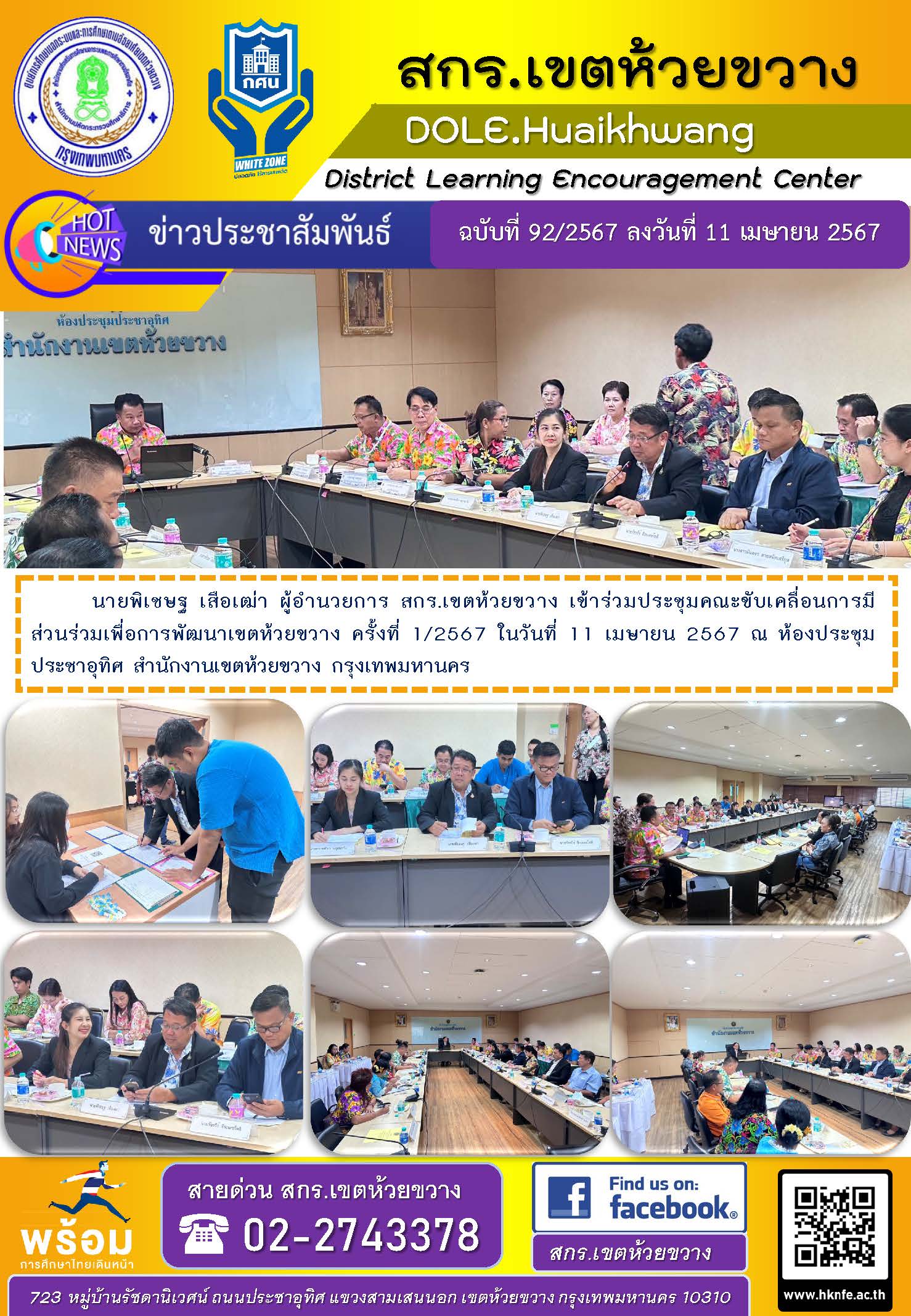 นายพิเชษฐ เสือเฒ่า ผู้อำนวยการ สกร.เขตห้วยขวาง เข้าร่วมประชุมคณะขับเคลื่อนการมีส่วนร่วมเพื่อการพัฒนาเขตห้วยขวาง ครั้งที่ 1/2567 ในวันที่ 11 เมษายน 2567 ณ ห้องประชุมประชาอุทิศ สำนักงานเขตห้วยขวาง กรุงเทพมหานคร