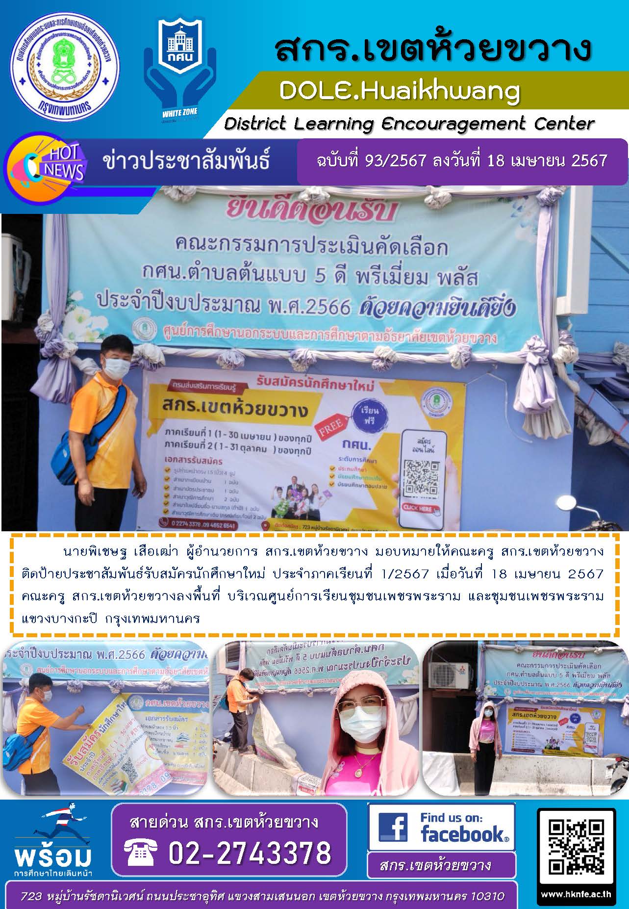 นายพิเชษฐ เสือเฒ่า ผู้อำนวยการ สกร.เขตห้วยขวาง มอบหมายให้คณะครู สกร.เขตห้วยขวาง ติดป้ายประชาสัมพันธ์รับสมัครนักศึกษาใหม่ ประจำภาคเรียนที่ 1/2567 เมื่อวันที่ 18 เมษายน 2567 คณะครู สกร.เขตห้วยขวางลงพื้นที่ บริเวณศูนย์การเรียนชุมชนเพชรพระราม และชุมชนเพชรพระราม แขวงบางกะปิ กรุงเทพมหานคร