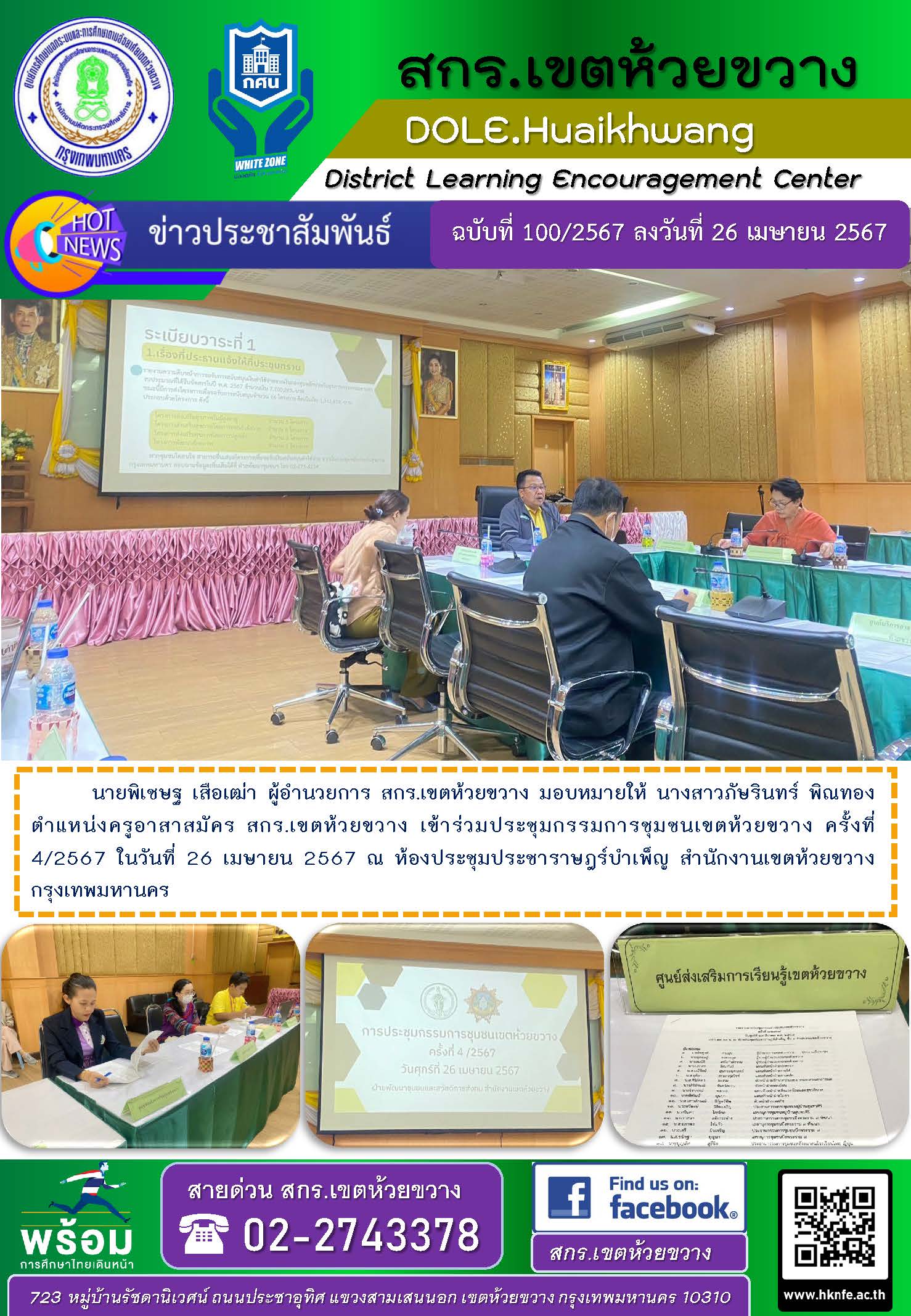 นายพิเชษฐ เสือเฒ่า ผู้อำนวยการ สกร.เขตห้วยขวาง มอบหมายให้ นางสาวภัษรินทร์ พิณทอง ตำแหน่งครูอาสาสมัคร สกร.เขตห้วยขวาง เข้าร่วมประชุมกรรมการชุมชนเขตห้วยขวาง ครั้งที่ 4/2567 ในวันที่ 26 เมษายน 2567 ณ ห้องประชุมประชาราษฎร์บำเพ็ญ สำนักงานเขตห้วยขวาง กรุงเทพมหานคร