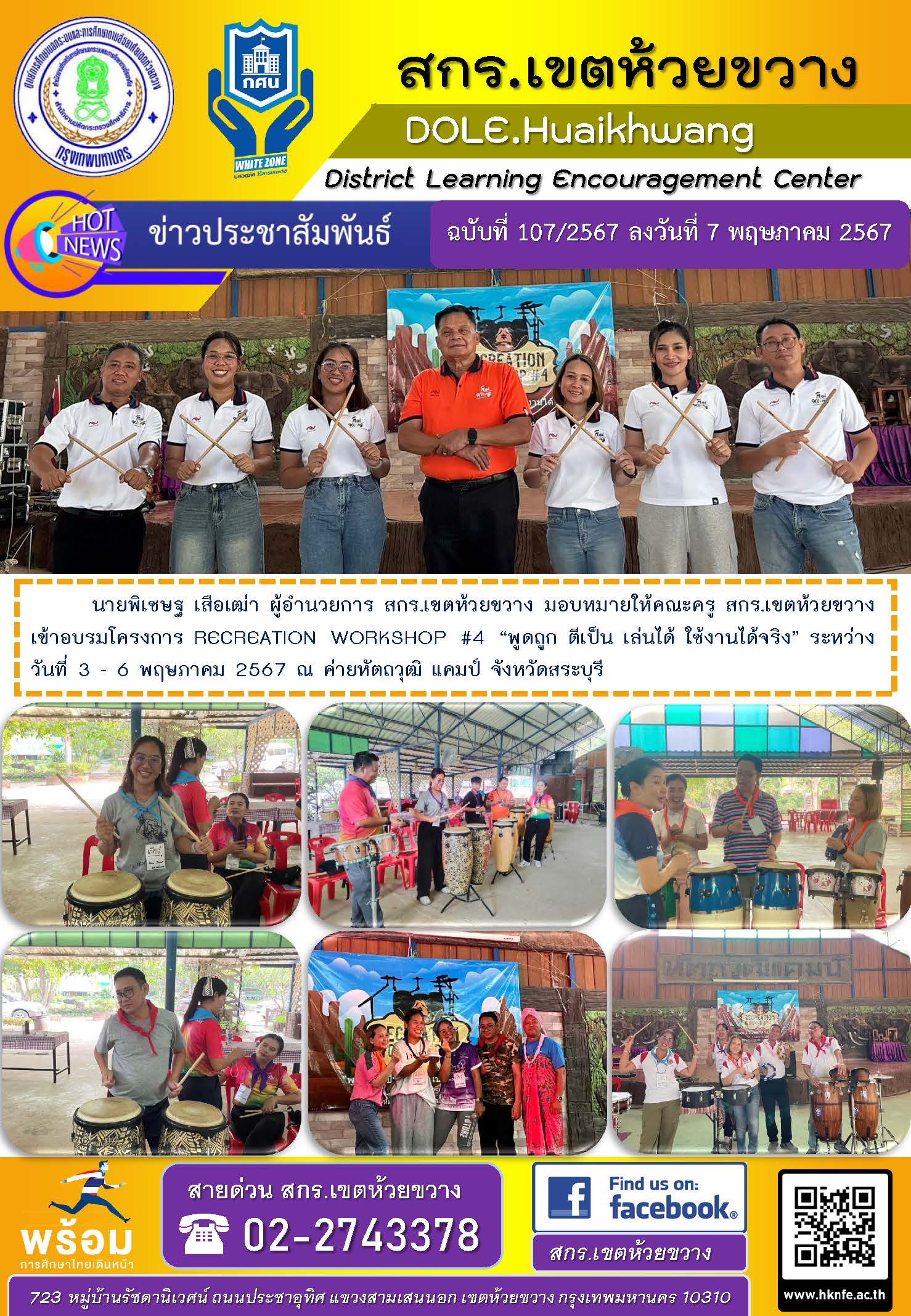 นายพิเชษฐ เสือเฒ่า ผู้อำนวยการ สกร.เขตห้วยขวาง มอบหมายให้คณะครู สกร.เขตห้วยขวาง เข้าอบรมโครงการ RECREATION WORKSHOP #4 “พูดถูก ตีเป็น เล่นได้ ใช้งานได้จริง” ระหว่างวันที่ 3 - 6 พฤษภาคม 2567 ณ ค่ายหัตถวุฒิ แคมป์ จังหวัดสระบุรี