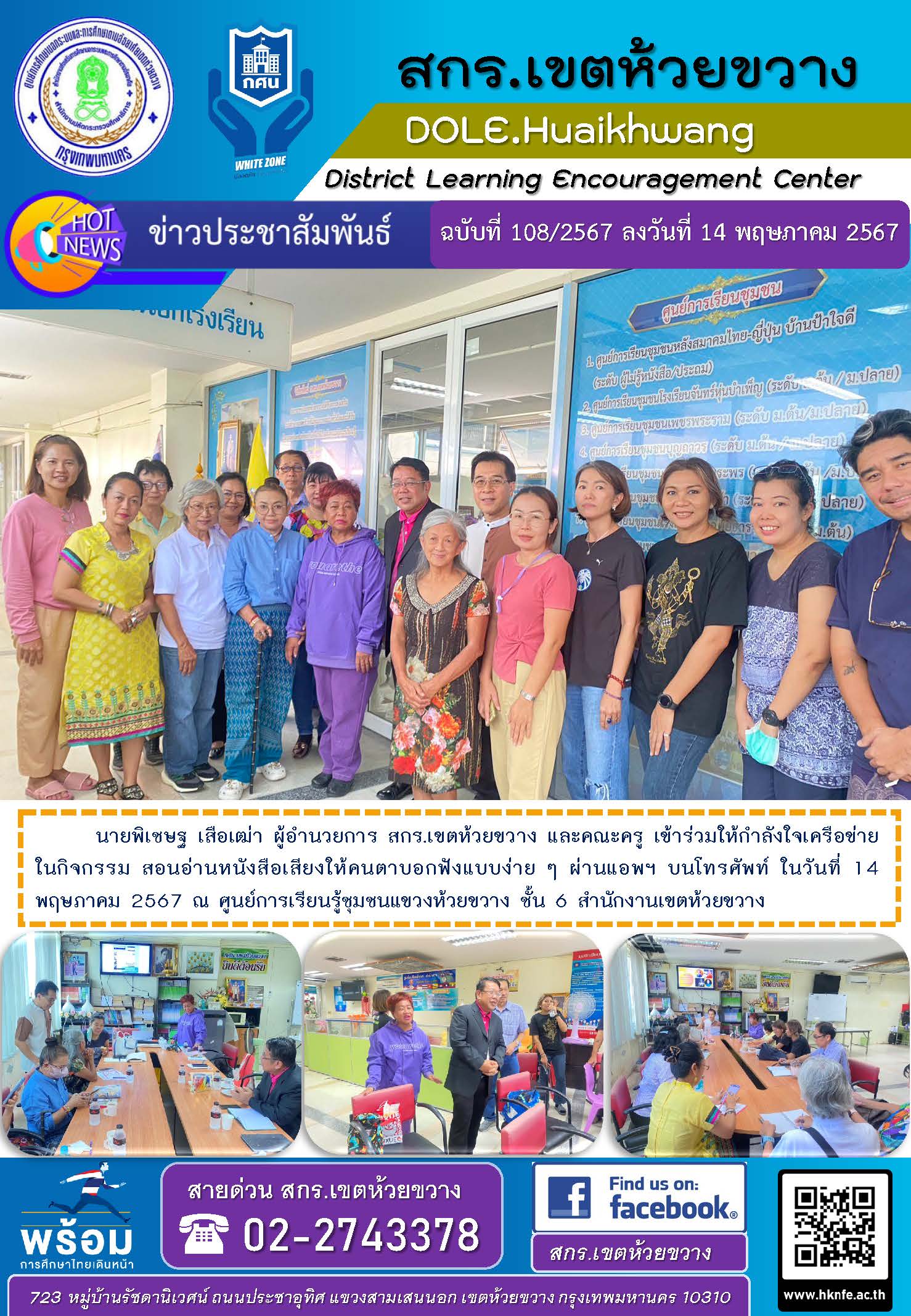 นายพิเชษฐ เสือเฒ่า ผู้อำนวยการ สกร.เขตห้วยขวาง และคณะครู เข้าร่วมให้กำลังใจเครือข่าย ในกิจกรรม สอนอ่านหนังสือเสียงให้คนตาบอกฟังแบบง่าย ๆ ผ่านแอพฯ บนโทรศัพท์ ในวันที่ 14 พฤษภาคม 2567 ณ ศูนย์การเรียนรู้ชุมชนแขวงห้วยขวาง ชั้น 6 สำนักงานเขตห้วยขวาง