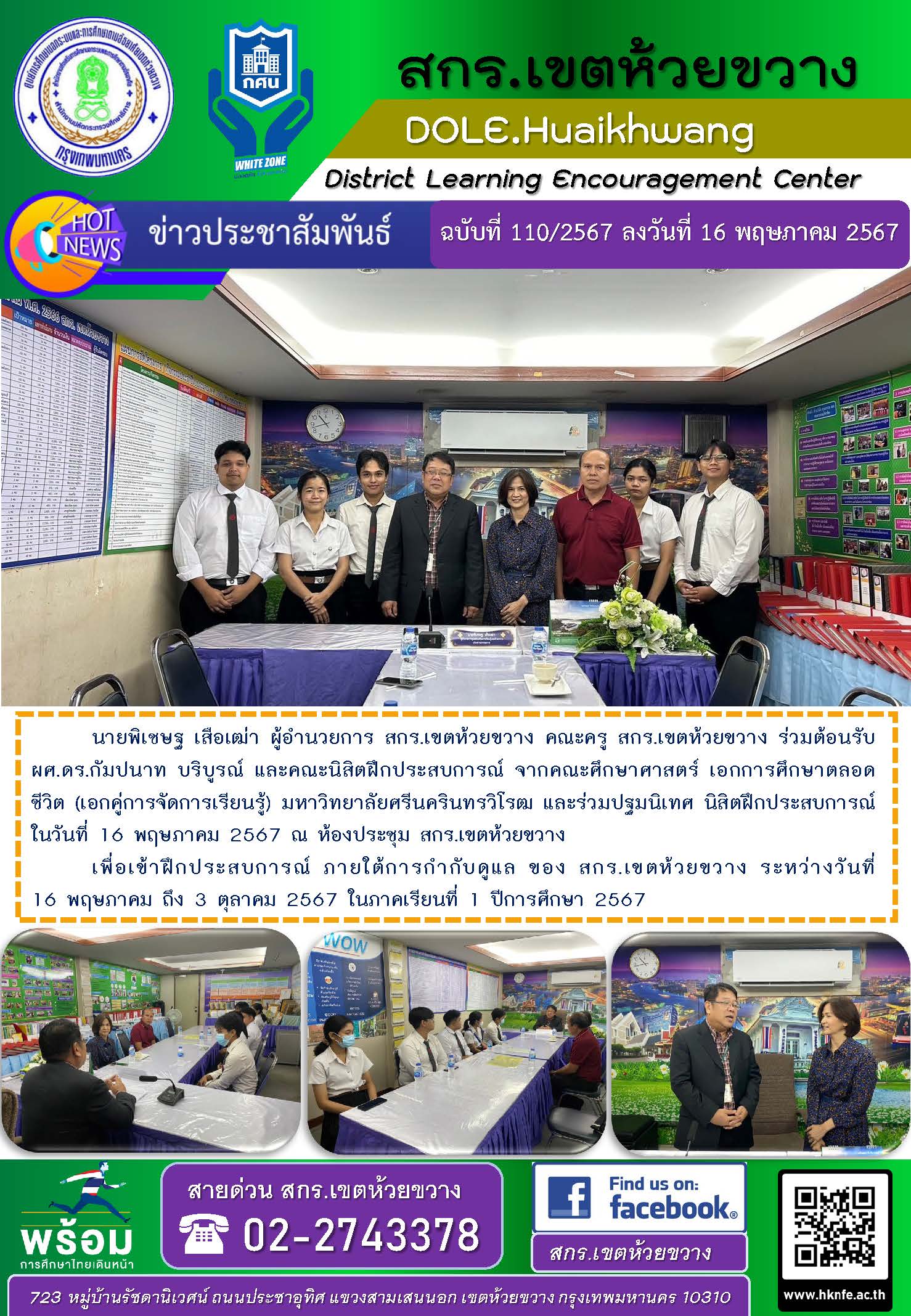 เพื่อเข้าฝึกประสบการณ์ ภายใต้การกำกับดูแล ของ สกร.เขตห้วยขวาง ระหว่างวันที่ 16 พฤษภาคม ถึง 3 ตุลาคม 2567 ในภาคเรียนที่ 1 ปีการศึกษา 2567