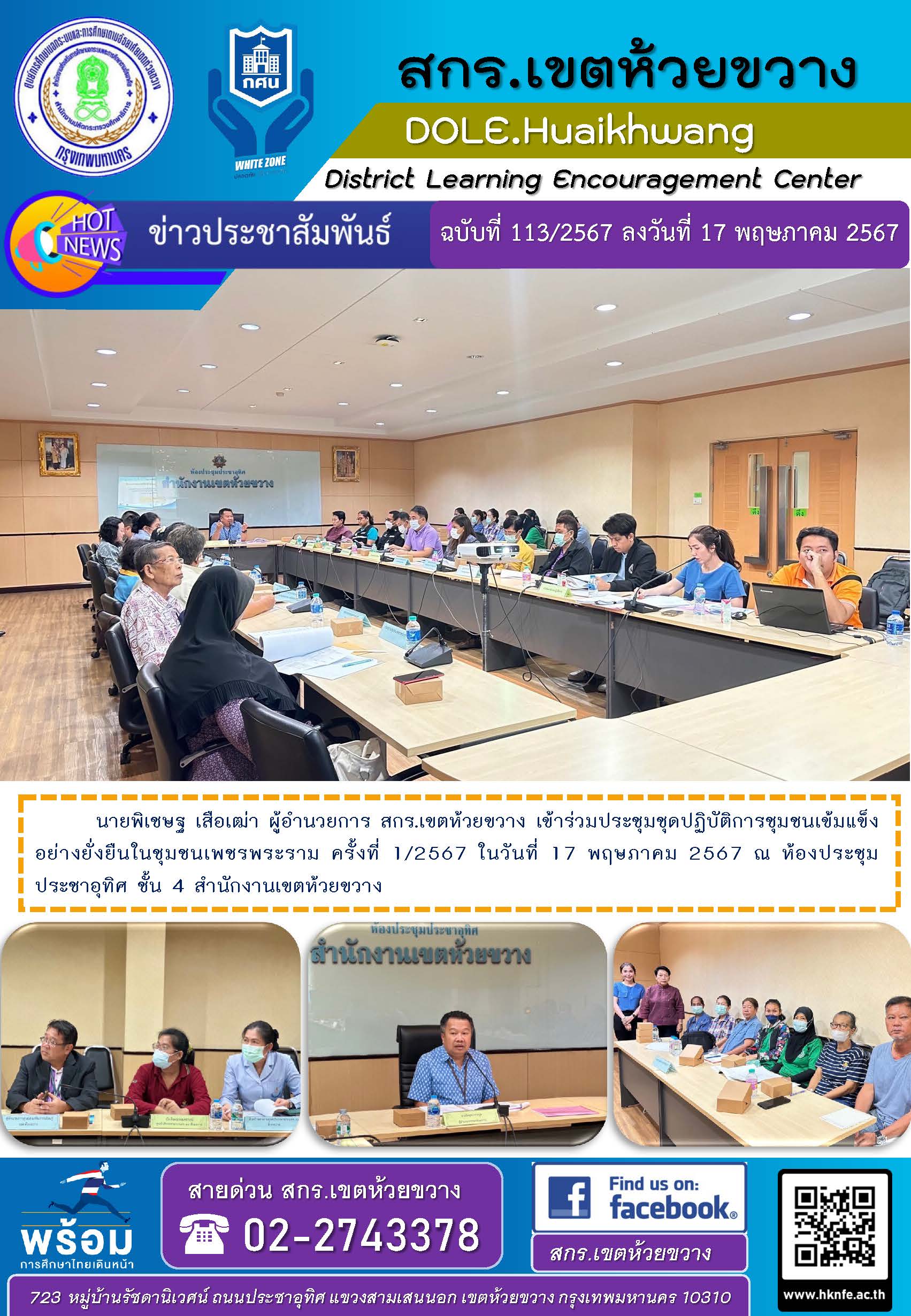 นายพิเชษฐ เสือเฒ่า ผู้อำนวยการ สกร.เขตห้วยขวาง เข้าร่วมประชุมชุดปฏิบัติการชุมชนเข้มแข็งอย่างยั่งยืนในชุมชนเพชรพระราม ครั้งที่ 1/2567 ในวันที่ 17 พฤษภาคม 2567 ณ ห้องประชุมประชาอุทิศ ชั้น 4 สำนักงานเขตห้วยขวาง