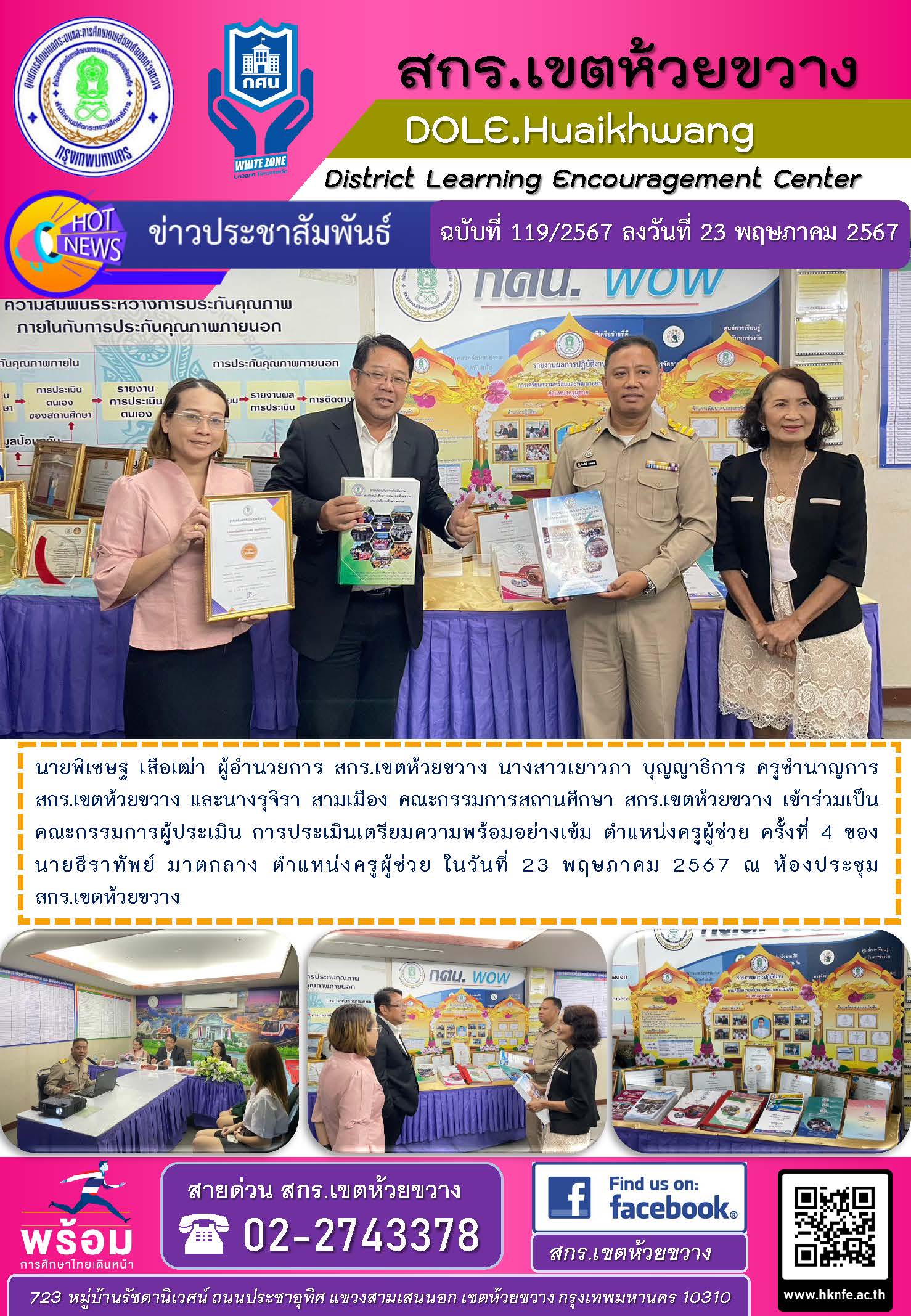 นายพิเชษฐ เสือเฒ่า ผู้อำนวยการ สกร.เขตห้วยขวาง นางสาวเยาวภา บุญญาธิการ ครูชำนาญการ สกร.เขตห้วยขวาง และนางรุจิรา สามเมือง คณะกรรมการสถานศึกษา สกร.เขตห้วยขวาง เข้าร่วมเป็นคณะกรรมการผู้ประเมิน การประเมินเตรียมความพร้อมอย่างเข้ม ตำแหน่งครูผู้ช่วย ครั้งที่ 4 ของ นายธีราทัพย์ มาตกลาง ตำแหน่งครูผู้ช่วย ในวันที่ 23 พฤษภาคม 2567 ณ ห้องประชุม สกร.เขตห้วยขวาง