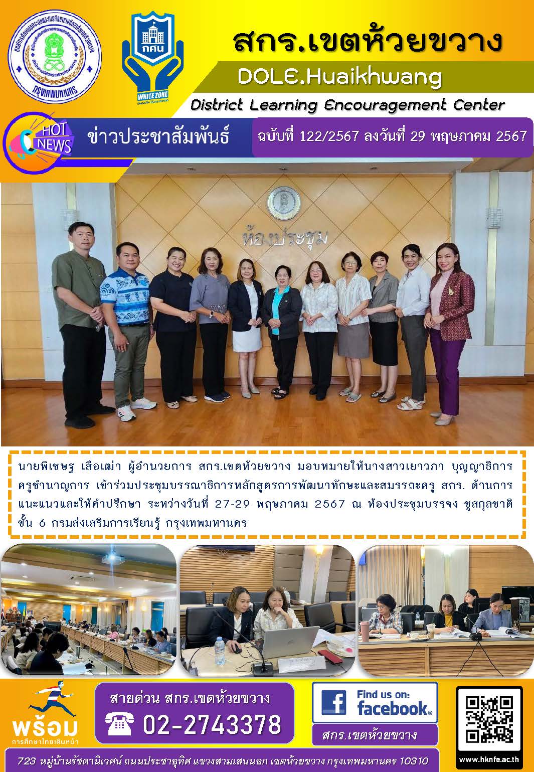 นายพิเชษฐ เสือเฒ่า ผู้อำนวยการ สกร.เขตห้วยขวาง มอบหมายให้นางสาวเยาวภา บุญญาธิการ ครูชำนาญการ เข้าร่วมประชุมบรรณาธิการหลักสูตรการพัฒนาทักษะและสมรรถะครู สกร. ด้านการแนะแนวและให้คำปรึกษา ระหว่างวันที่ 27-29 พฤษภาคม 2567 ณ ห้องประชุมบรรจง ชูสกุลชาติ ชั้น 6 กรมส่งเสริมการเรียนรู้ กรุงเทพมหานคร