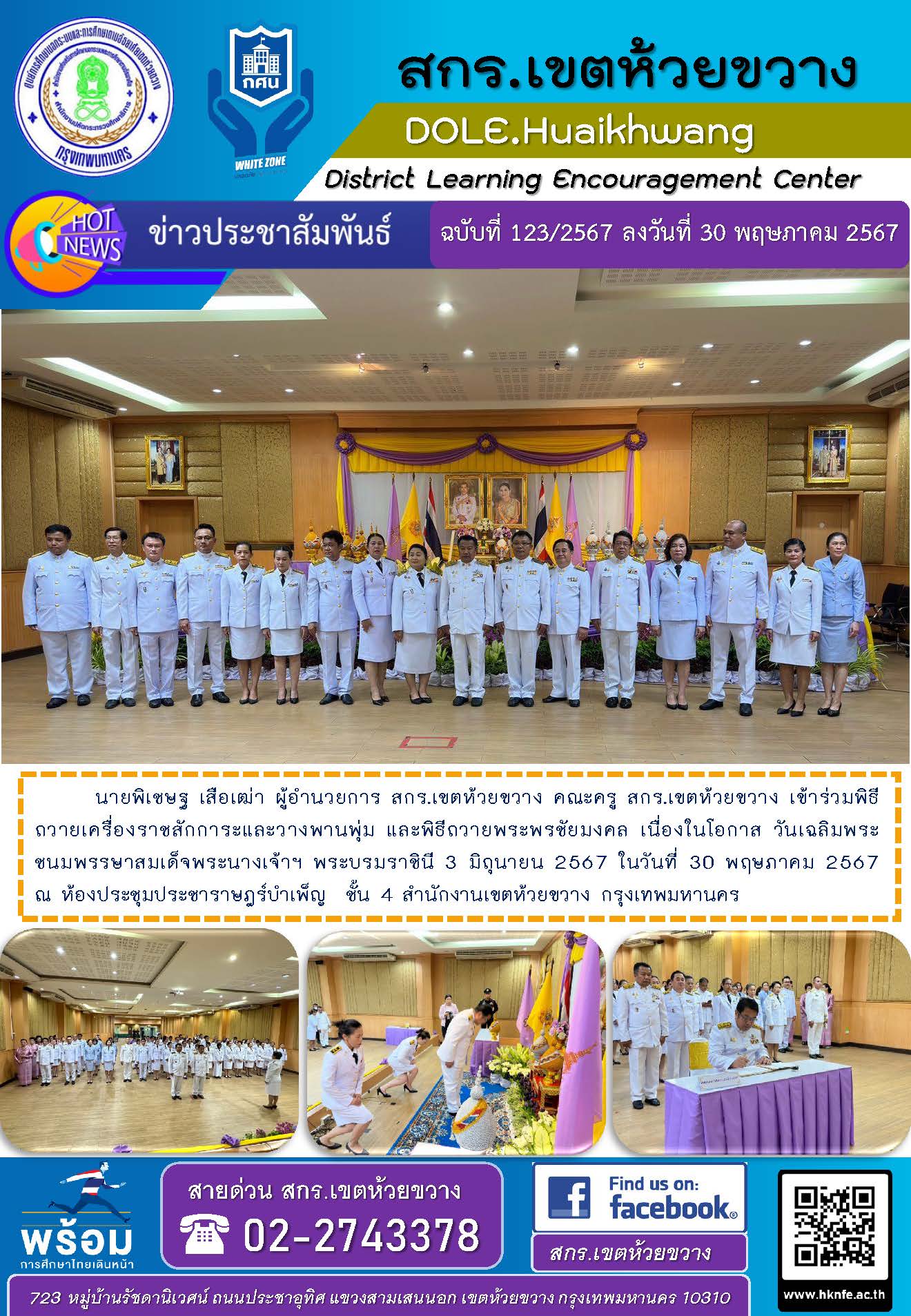 นายพิเชษฐ เสือเฒ่า ผู้อำนวยการ สกร.เขตห้วยขวาง คณะครู สกร.เขตห้วยขวาง เข้าร่วมพิธีถวายเครื่องราชสักการะและวางพานพุ่ม และพิธีถวายพระพรชัยมงคล เนื่องในโอกาส วันเฉลิมพระชนมพรรษาสมเด็จพระนางเจ้าฯ พระบรมราชินี 3 มิถุนายน 2567 ในวันที่ 30 พฤษภาคม 2567 ณ ห้องประชุมประชาราษฎร์บำเพ็ญ ชั้น 4 สำนักงานเขตห้วยขวาง กรุงเทพมหานคร