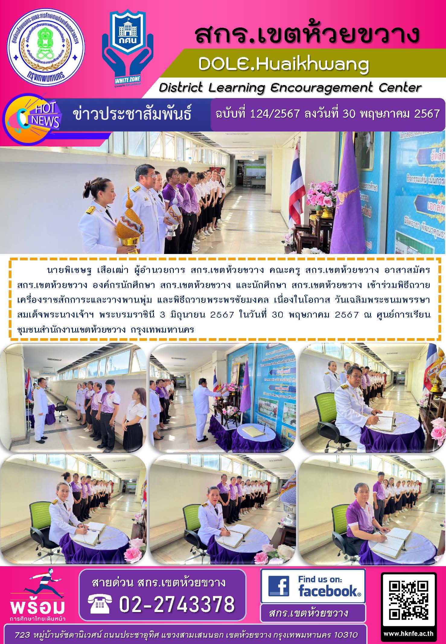 นายพิเชษฐ เสือเฒ่า ผู้อำนวยการ สกร.เขตห้วยขวาง คณะครู สกร.เขตห้วยขวาง อาสาสมัคร สกร.เขตห้วยขวาง องค์กรนักศึกษา สกร.เขตห้วยขวาง และนักศึกษา สกร.เขตห้วยขวาง เข้าร่วมพิธีถวายเครื่องราชสักการะและวางพานพุ่ม และพิธีถวายพระพรชัยมงคล เนื่องในโอกาส วันเฉลิมพระชนมพรรษาสมเด็จพระนางเจ้าฯ พระบรมราชินี 3 มิถุนายน 2567 ในวันที่ 30 พฤษภาคม 2567 ณ ศูนย์การเรียนชุมชนสำนักงานเขตห้วยขวาง กรุงเทพมหานคร