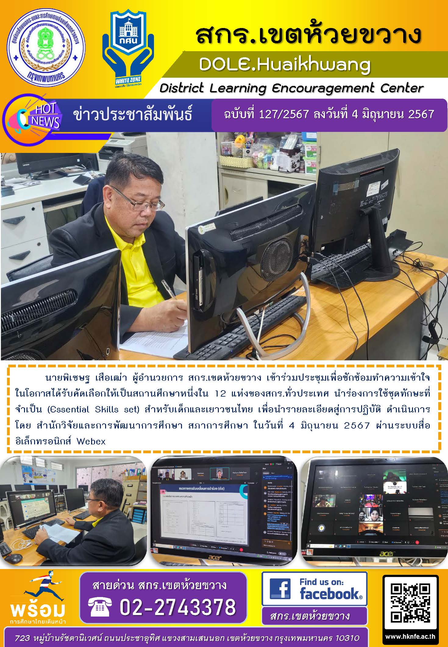 นายพิเชษฐ เสือเฒ่า ผู้อำนวยการ สกร.เขตห้วยขวาง เข้าร่วมประชุมเพื่อซักซ้อมทำความเข้าใจในโอกาสได้รับคัดเลือกให้เป็นสถานศึกษาหนึ่งใน 12 แห่งของสกร.ทั่วประเทศ นำร่องการใช้ชุดทักษะที่จำเป็น (Essential Skills set) สำหรับเด็กและเยาวชนไทย เพื่อนำรายละเอียดสู่การปฏิบัติ ดำเนินการโดย สำนักวิจัยและการพัฒนาการศึกษา สภาการศึกษา ในวันที่ 4 มิถุนายน 2567 ผ่านระบบสื่ออิเล็กทรอนิกส์ Webex