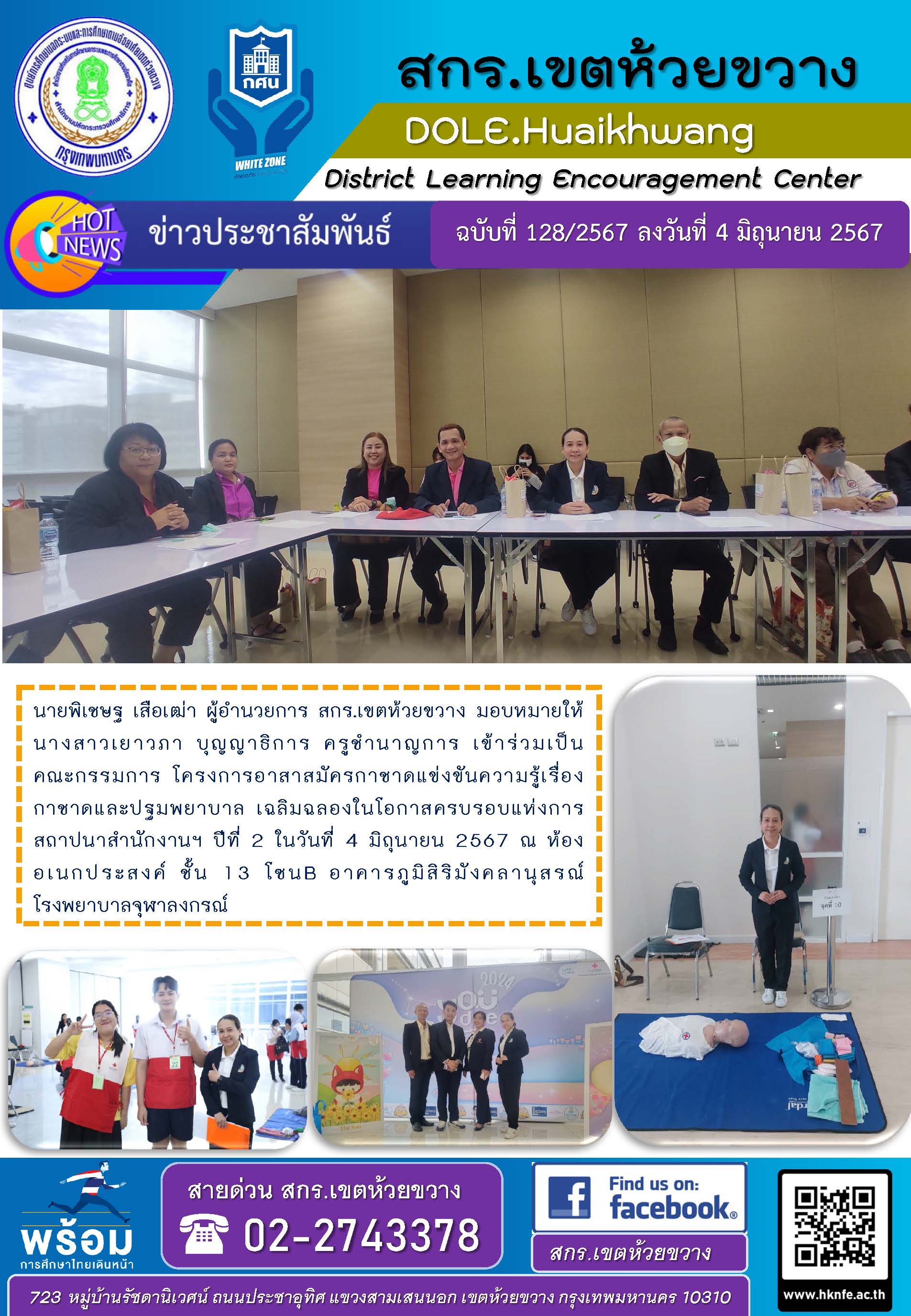 นายพิเชษฐ เสือเฒ่า ผู้อำนวยการ สกร.เขตห้วยขวาง มอบหมายให้นางสาวเยาวภา บุญญาธิการ ครูชำนาญการ เข้าร่วมเป็นคณะกรรมการ โครงการอาสาสมัครกาชาดแข่งขันความรู้เรื่องกาชาดและปฐมพยาบาล เฉลิมฉลองในโอกาสครบรอบแห่งการสถาปนาสำนักงานฯ ปีที่ 2 ในวันที่ 4 มิถุนายน 2567 ณ ห้องอเนกประสงค์ ชั้น 13 โซน B อาคารภูมิสิริมังคลานุสรณ์ โรงพยาบาลจุฬาลงกรณ์