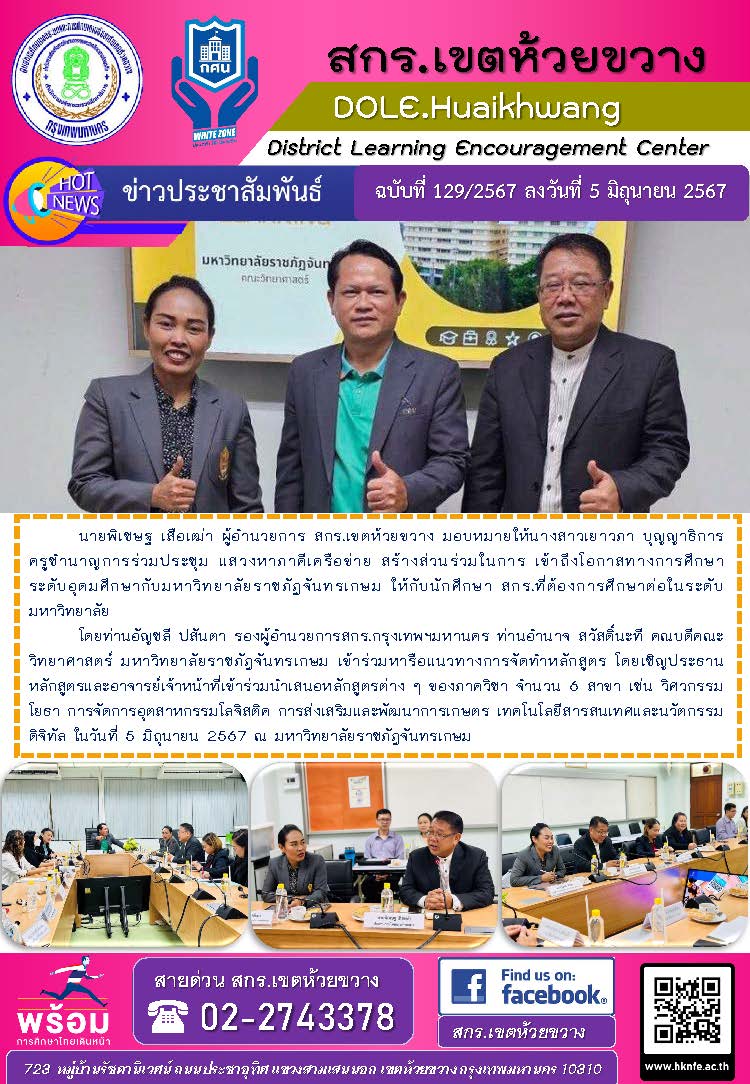 นายพิเชษฐ เสือเฒ่า ผู้อำนวยการ สกร.เขตห้วยขวาง มอบหมายให้นางสาวเยาวภา บุญญาธิการ ครูชำนาญการร่วมประชุม แสวงหาภาคีเครือข่าย สร้างส่วนร่วมในการ เข้าถึงโอกาสทางการศึกษาระดับอุดมศึกษากับมหาวิทยาลัยราชภัฏจันทรเกษม ให้กับนักศึกษา สกร.ที่ต้องการศึกษาต่อในระดับมหาวิทยาลัย