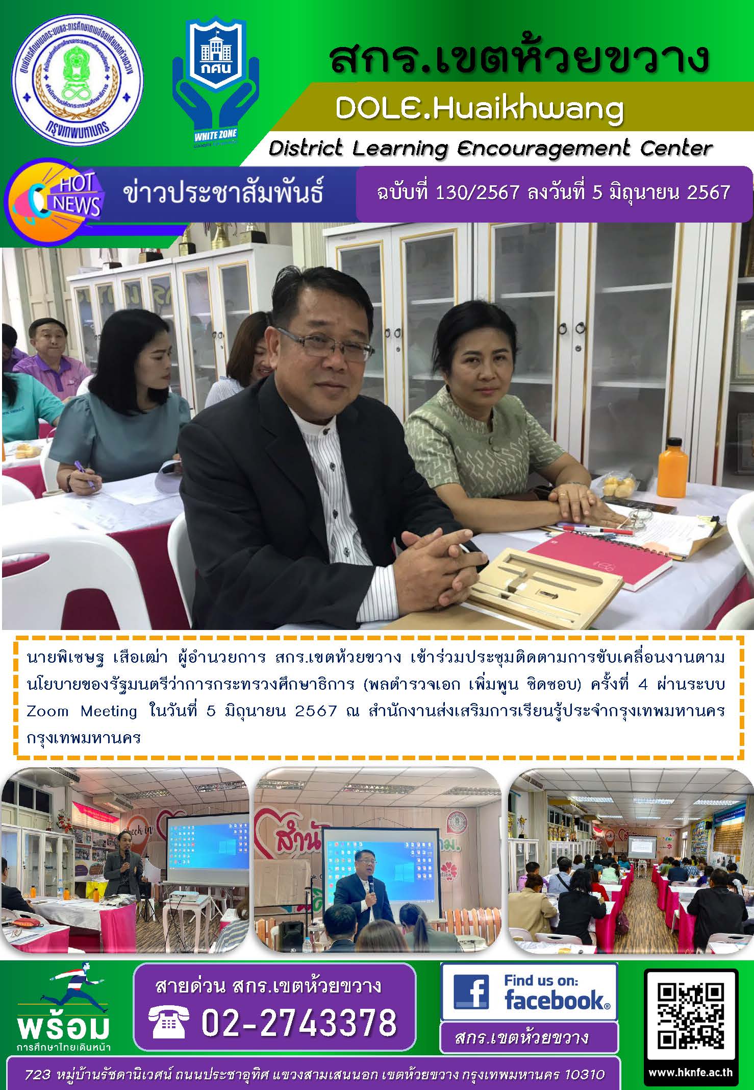 นายพิเชษฐ เสือเฒ่า ผู้อำนวยการ สกร.เขตห้วยขวาง เข้าร่วมประชุมติดตามการขับเคลื่อนงานตามนโยบายของรัฐมนตรีว่าการกระทรวงศึกษาธิการ (พลตำรวจเอก เพิ่มพูน ชิดชอบ) ครั้งที่ 4 ผ่านระบบ Zoom Meeting ในวันที่ 5 มิถุนายน 2567 ณ สำนักงานส่งเสริมการเรียนรู้ประจำกรุงเทพมหานคร กรุงเทพมหานคร