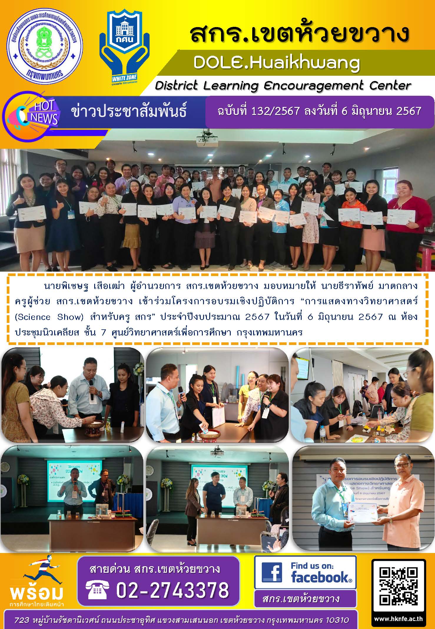 นายพิเชษฐ เสือเฒ่า ผู้อำนวยการ สกร.เขตห้วยขวาง มอบหมายให้ นายธีราทัพย์ มาตกลาง ครูผู้ช่วย สกร.เขตห้วยขวาง เข้าร่วมโครงการอบรมเชิงปฏิบัติการ “การแสดงทางวิทยาศาสตร์ (Science Show) สำหรับครู สกร” ประจำปีงบประมาณ 2567 ในวันที่ 6 มิถุนายน 2567 ณ ห้องประชุมนิวเคลียส ชั้น 7 ศูนย์วิทยาศาสตร์เพื่อการศึกษา กรุงเทพมหานคร