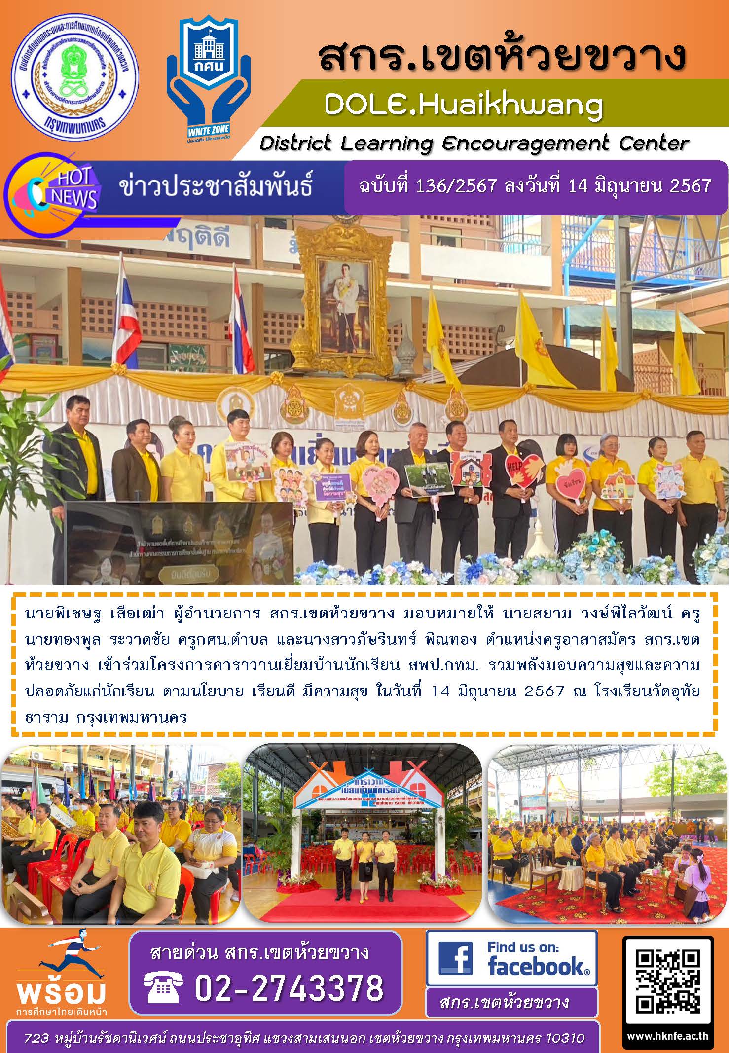 นายพิเชษฐ เสือเฒ่า ผู้อำนวยการ สกร.เขตห้วยขวาง มอบหมายให้ นายสยาม วงษ์พิไลวัฒน์ ครู นายทองพูล ระวาดชัย ครูกศน.ตำบล และนางสาวภัษรินทร์ พิณทอง ตำแหน่งครูอาสาสมัคร สกร.เขตห้วยขวาง เข้าร่วมโครงการคาราวานเยี่ยมบ้านนักเรียน สพป.กทม. รวมพลังมอบความสุขและความปลอดภัยแก่นักเรียน ตามนโยบาย เรียนดี มึความสุข ในวันที่ 14 มิถุนายน 2567 ณ โรงเรียนวัดอุทัยธาราม กรุงเทพมหานคร