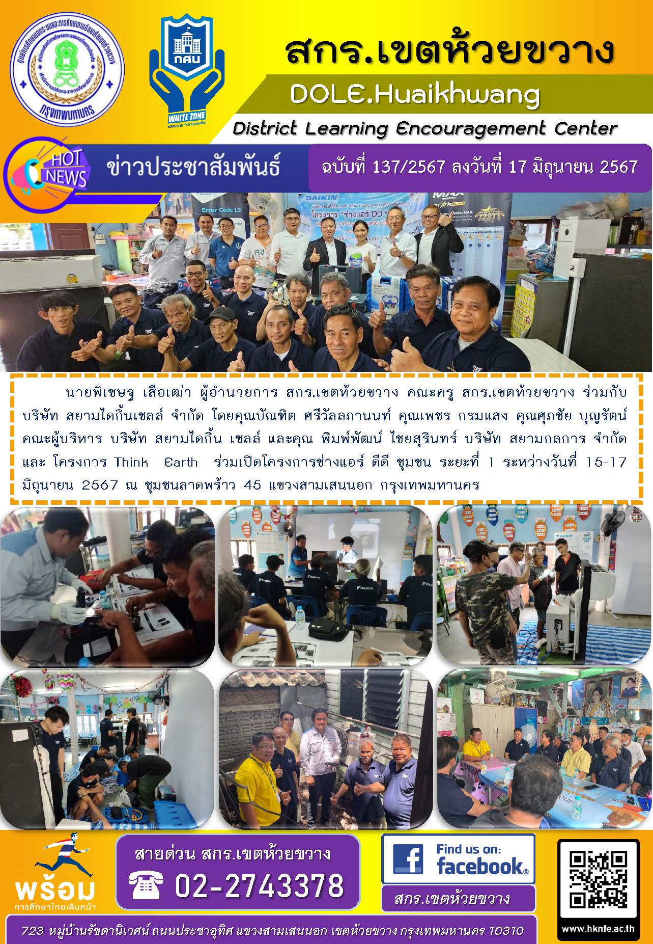 นายพิเชษฐ เสือเฒ่า ผู้อำนวยการ สกร.เขตห้วยขวาง คณะครู สกร.เขตห้วยขวาง ร่วมกับ บริษัท สยามไดกิ้นเซลล์ จำกัด โดยคุณบัณฑิต ศรีวัลลภานนท์ คุณเพชร กรมแสง คุณศุภชัย บุญรัตน์ คณะผู้บริหาร บริษัท สยามไดกิ้น เซลล์ และคุณ พิมพ์พัฒน์ ไชยสุรินทร์ บริษัท สยามกลการ จำกัด และ โครงการ Think Earth ร่วมเปิดโครงการช่างแอร์ ดีดี ชุมชน ระยะที่ 1 ระหว่างวันที่ 15-17 มิถุนายน 2567 ณ ชุมชนลาดพร้าว 45 แขวงสามเสนนอก กรุงเทพมหานคร