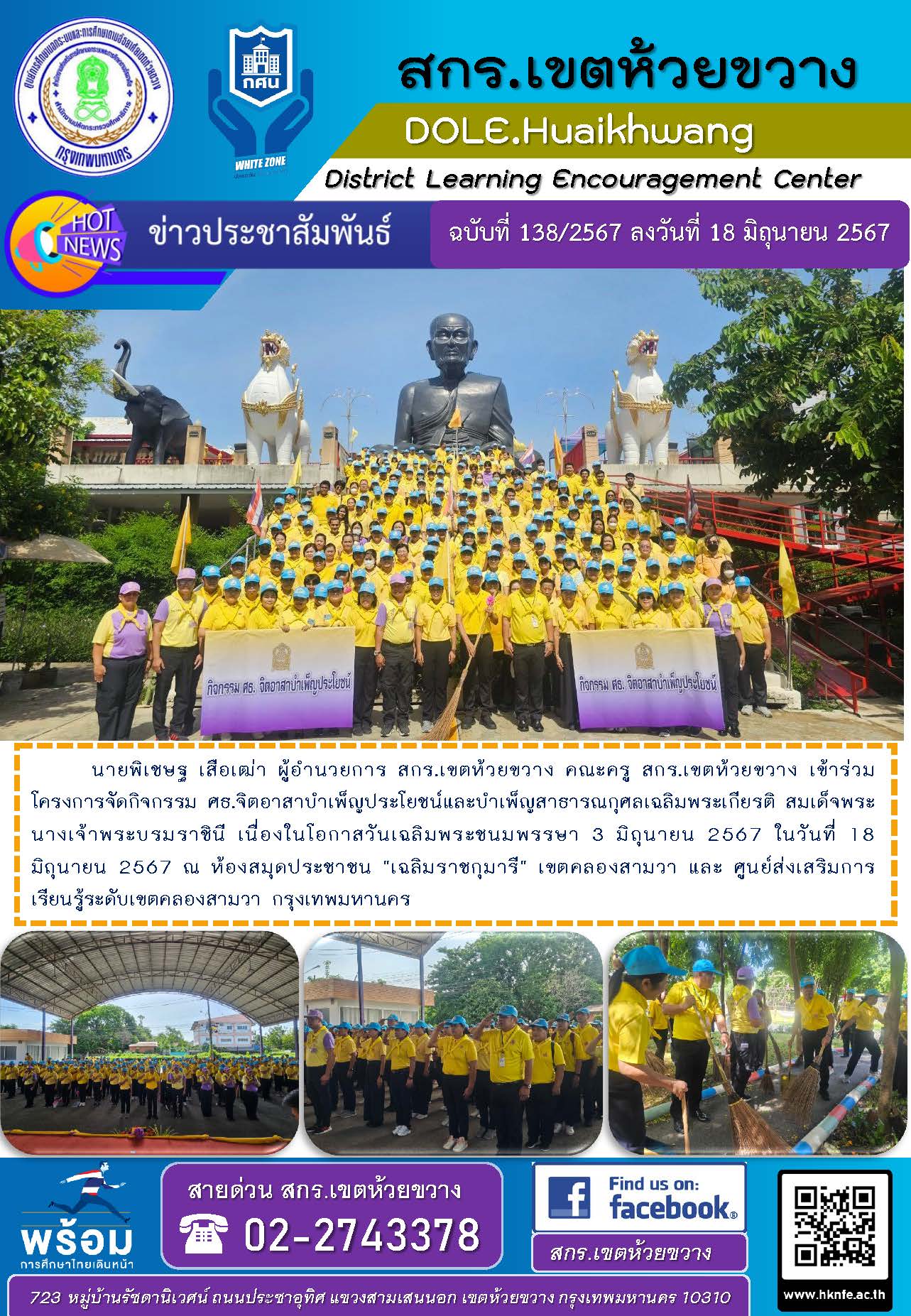 นายพิเชษฐ เสือเฒ่า ผู้อำนวยการ สกร.เขตห้วยขวาง คณะครู สกร.เขตห้วยขวาง เข้าร่วมโครงการจัดกิจกรรม ศธ.จิตอาสาบำเพ็ญประโยชน์และบำเพ็ญสาธารณกุศลเฉลิมพระเกียรติ สมเด็จพระนางเจ้าพระบรมราชินี เนื่องในโอกาสวันเฉลิมพระชนมพรรษา 3 มิถุนายน 2567 ในวันที่ 18 มิถุนายน 2567 ณ ห้องสมุดประชาชน "เฉลิมราชกุมารี" เขตคลองสามวา และ ศูนย์ส่งเสริมการเรียนรู้ระดับเขตคลองสามวา กรุงเทพมหานคร