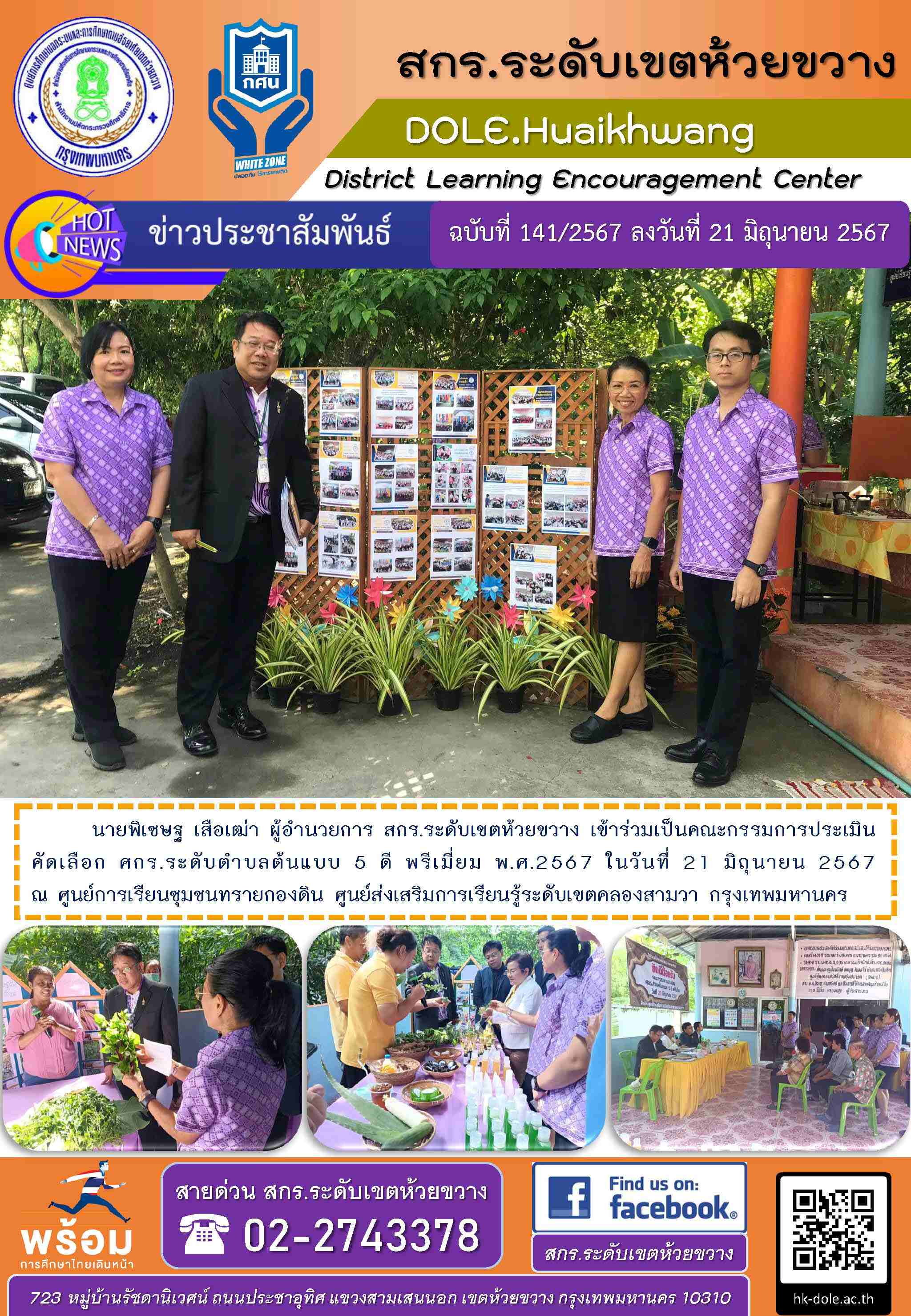 นายพิเชษฐ เสือเฒ่า ผู้อำนวยการ สกร.ระดับเขตห้วยขวาง เข้าร่วมเป็นคณะกรรมการประเมินคัดเลือก ศกร.ระดับตำบลต้นแบบ 5 ดี พรีเมี่ยม พ.ศ.2567 ในวันที่ 21 มิถุนายน 2567 ณ ศูนย์การเรียนชุมชนทรายกองดิน ศูนย์ส่งเสริมการเรียนรู้ระดับเขตคลองสามวา กรุงเทพมหานคร