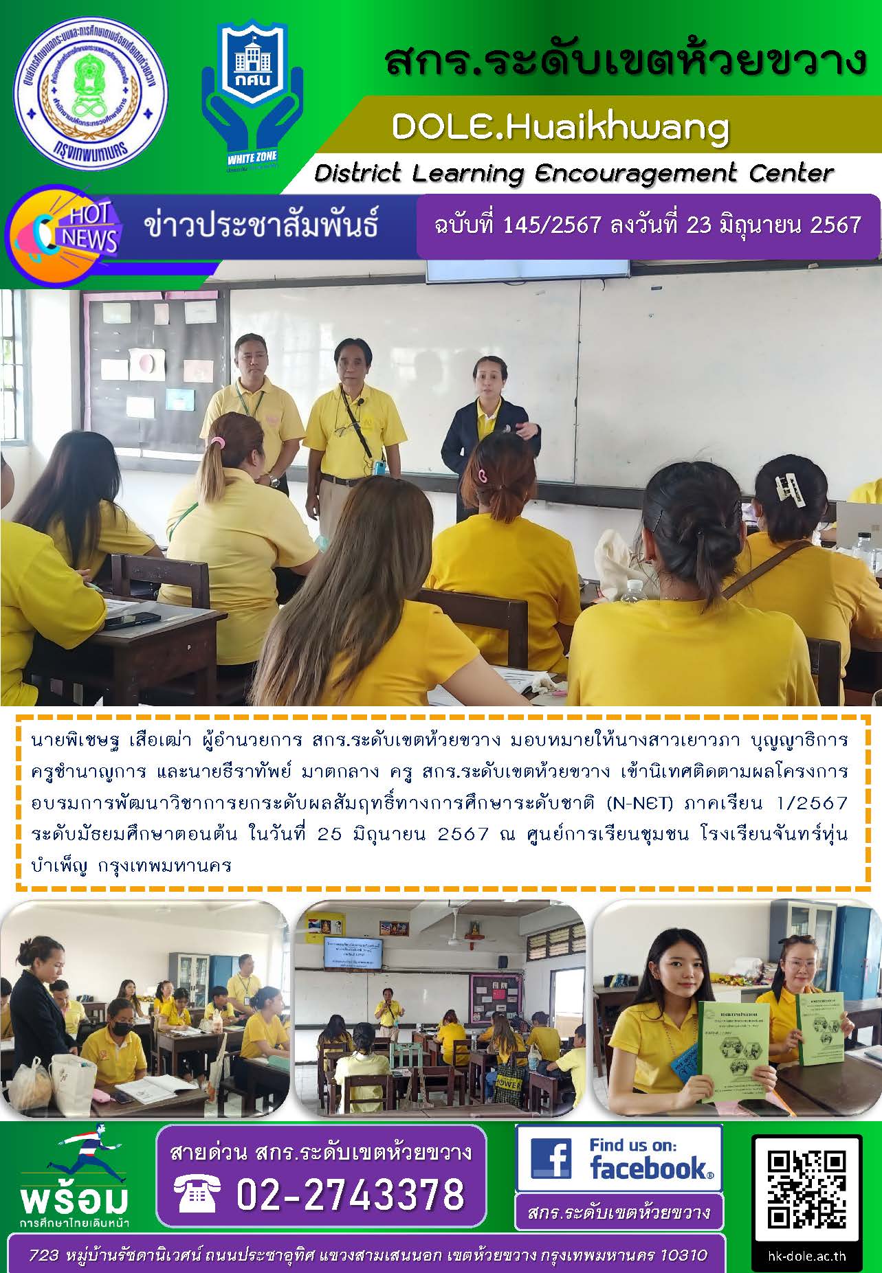 นายพิเชษฐ เสือเฒ่า ผู้อำนวยการ สกร.ระดับเขตห้วยขวาง มอบหมายให้นางสาวเยาวภา บุญญาธิการ ครูชำนาญการ และนายธีราทัพย์ มาตกลาง ครู สกร.ระดับเขตห้วยขวาง เข้านิเทศติดตามผลโครงการอบรมการพัฒนาวิชาการยกระดับผลสัมฤทธิ์ทางการศึกษาระดับชาติ (N-NET) ภาคเรียน 1/2567 ระดับมัธยมศึกษาตอนต้น ในวันที่ 25 มิถุนายน 2567 ณ ศูนย์การเรียนชุมชน โรงเรียนจันทร์หุ่นบำเพ็ญ กรุงเทพมหานคร