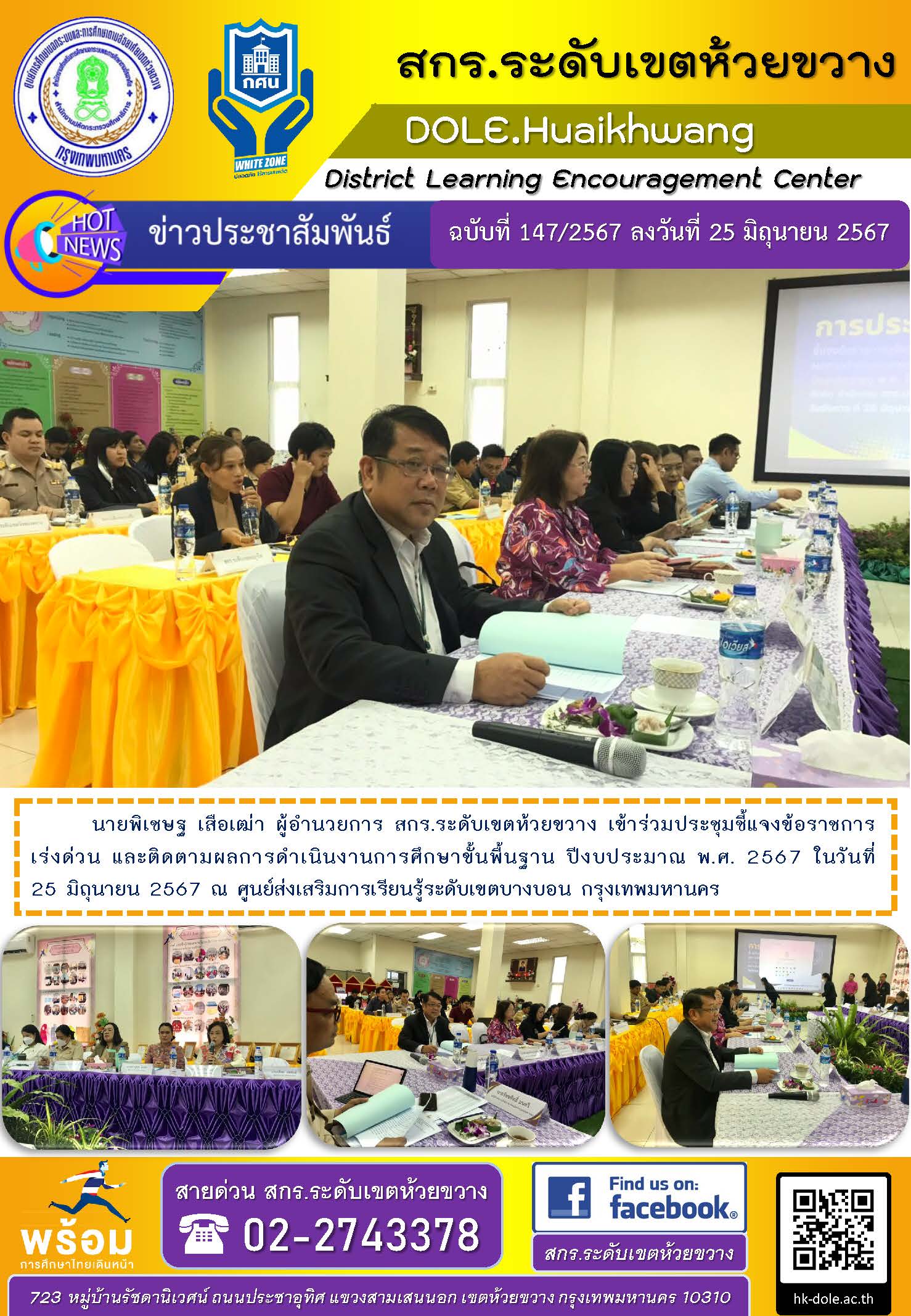 นายพิเชษฐ เสือเฒ่า ผู้อำนวยการ สกร.ระดับเขตห้วยขวาง เข้าร่วมประชุมชี้แจงข้อราชการเร่งด่วน และติดตามผลการดำเนินงานการศึกษาขั้นพื้นฐาน ปีงบประมาณ พ.ศ. 2567 ในวันที่ 25 มิถุนายน 2567 ณ ศูนย์ส่งเสริมการเรียนรู้ระดับเขตบางบอน กรุงเทพมหานคร