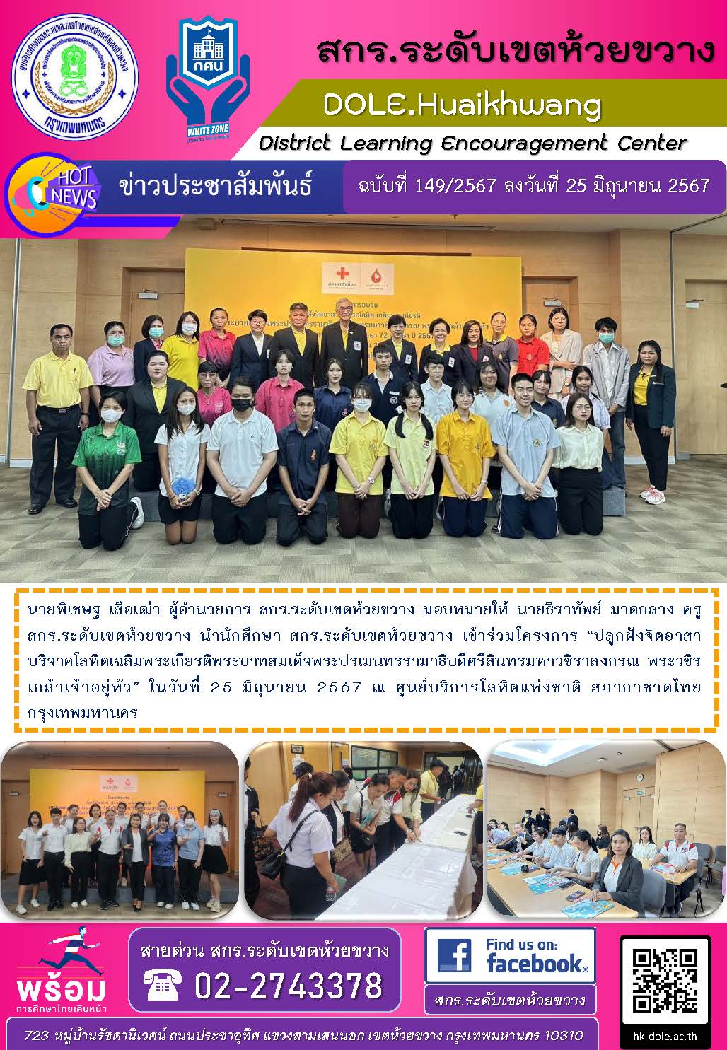 นายพิเชษฐ เสือเฒ่า ผู้อำนวยการ สกร.ระดับเขตห้วยขวาง มอบหมายให้ นายธีราทัพย์ มาตกลาง ครู สกร.ระดับเขตห้วยขวาง นำนักศึกษา สกร.ระดับเขตห้วยขวาง เข้าร่วมโครงการ “ปลูกฝังจิตอาสาบริจาคโลหิตเฉลิมพระเกียรติพระบาทสมเด็จพระปรเมนทรรามาธิบดีศรีสินทรมหาวชิราลงกรณ พระวชิรเกล้าเจ้าอยู่หัว” ในวันที่ 25 มิถุนายน 2567 ณ ศูนย์บริการโลหิตแห่งชาติ สภากาชาดไทย กรุงเทพมหานคร