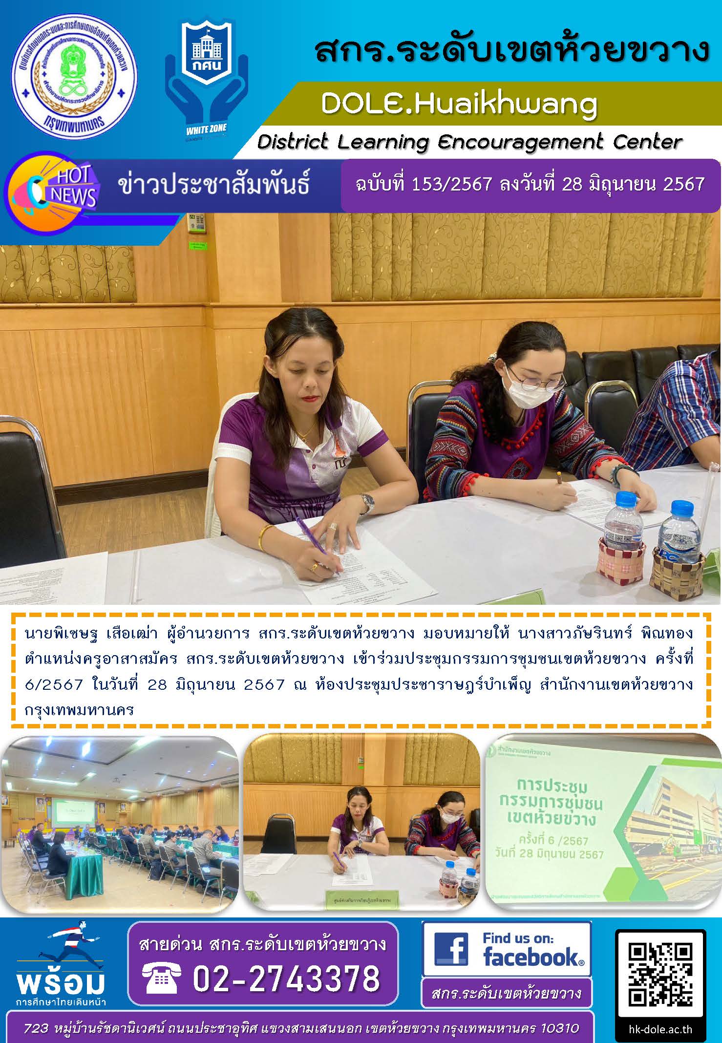 นายพิเชษฐ เสือเฒ่า ผู้อำนวยการ สกร.ระดับเขตห้วยขวาง มอบหมายให้ นางสาวภัษรินทร์ พิณทอง ตำแหน่งครูอาสาสมัคร สกร.ระดับเขตห้วยขวาง เข้าร่วมประชุมกรรมการชุมชนเขตห้วยขวาง ครั้งที่ 6/2567 ในวันที่ 28 มิถุนายน 2567 ณ ห้องประชุมประชาราษฎร์บำเพ็ญ สำนักงานเขตห้วยขวาง กรุงเทพมหานคร