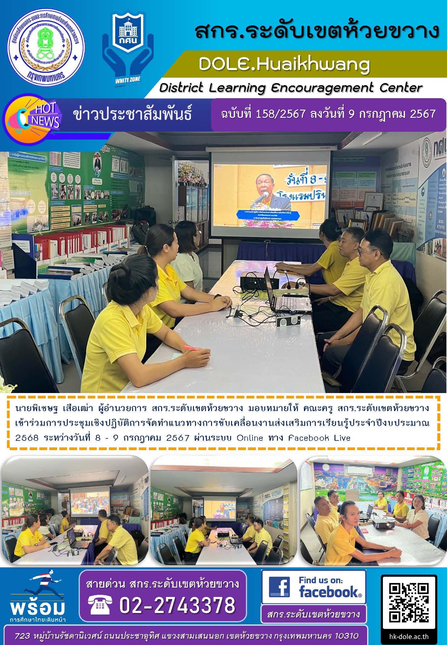 นายพิเชษฐ เสือเฒ่า ผู้อำนวยการ สกร.ระดับเขตห้วยขวาง มอบหมายให้ คณะครู สกร.ระดับเขตห้วยขวาง เข้าร่วมการประชุมเชิงปฏิบัติการจัดทำแนวทางการขับเคลื่อนงานส่งเสริมการเรียนรู้ประจำปีงบประมาณ 2568 ระหว่างวันที่ 8 - 9 กรกฎาคม 2567 ผ่านระบบ Online ทาง Facebook Live