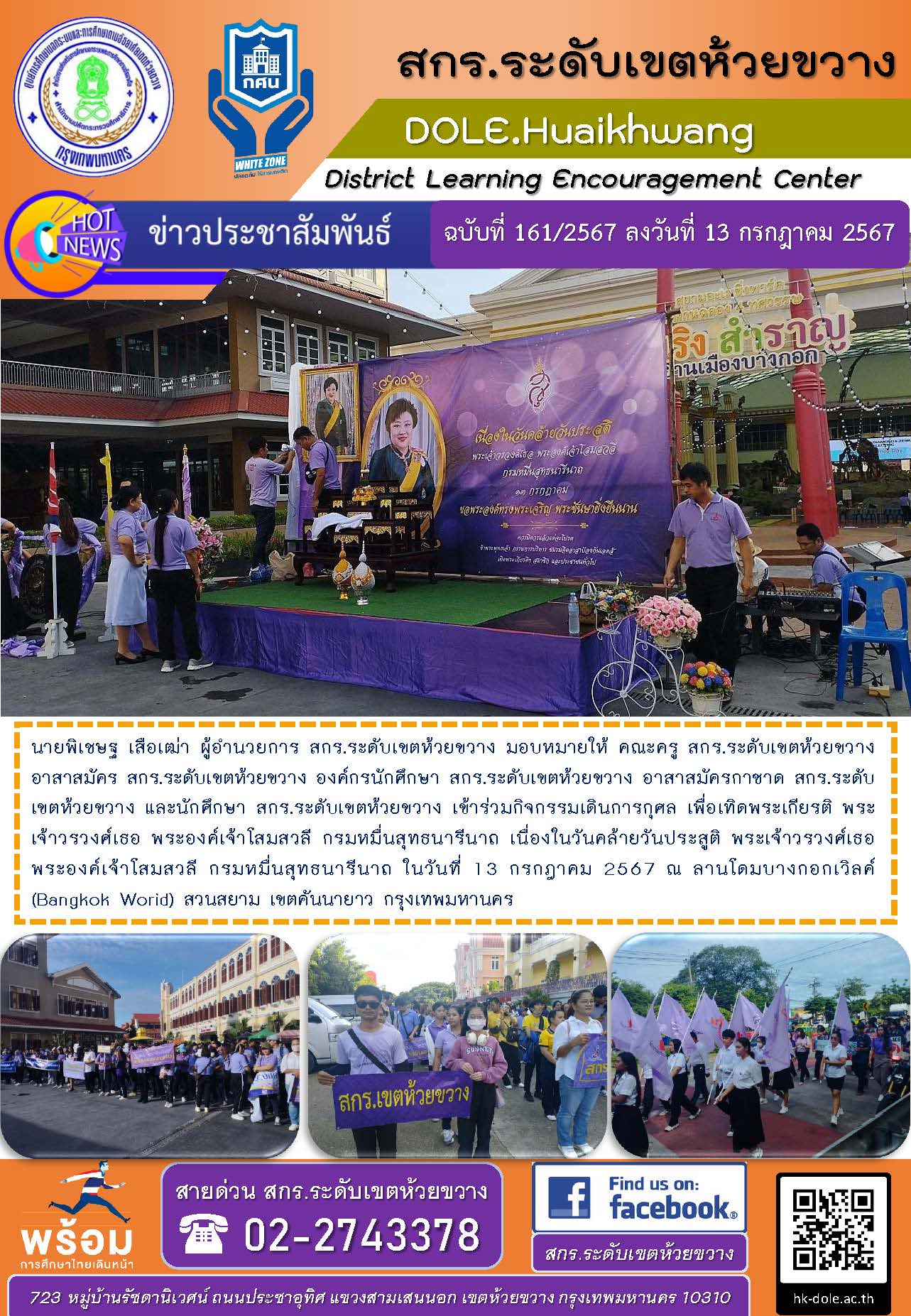 นายพิเชษฐ เสือเฒ่า ผู้อำนวยการ สกร.ระดับเขตห้วยขวาง มอบหมายให้ คณะครู สกร.ระดับเขตห้วยขวาง อาสาสมัคร สกร.ระดับเขตห้วยขวาง องค์กรนักศึกษา สกร.ระดับเขตห้วยขวาง อาสาสมัครกาชาด สกร.ระดับเขตห้วยขวาง และนักศึกษา สกร.ระดับเขตห้วยขวาง เข้าร่วมกิจกรรมเดินการกุศล เพื่อเทิดพระเกียรติ พระเจ้าวรวงศ์เธอ พระองค์เจ้าโสมสวลี กรมหมื่นสุทธนารีนาถ เนื่องในวันคล้ายวันประสูติ พระเจ้าวรวงศ์เธอ พระองค์เจ้าโสมสวลี กรมหมื่นสุทธนารีนาถ ในวันที่ 13 กรกฎาคม 2567 ณ ลานโดมบางกอกเวิลค์ (Bangkok Worid) สวนสยาม เขตคันนายาว กรุงเทพมหานคร