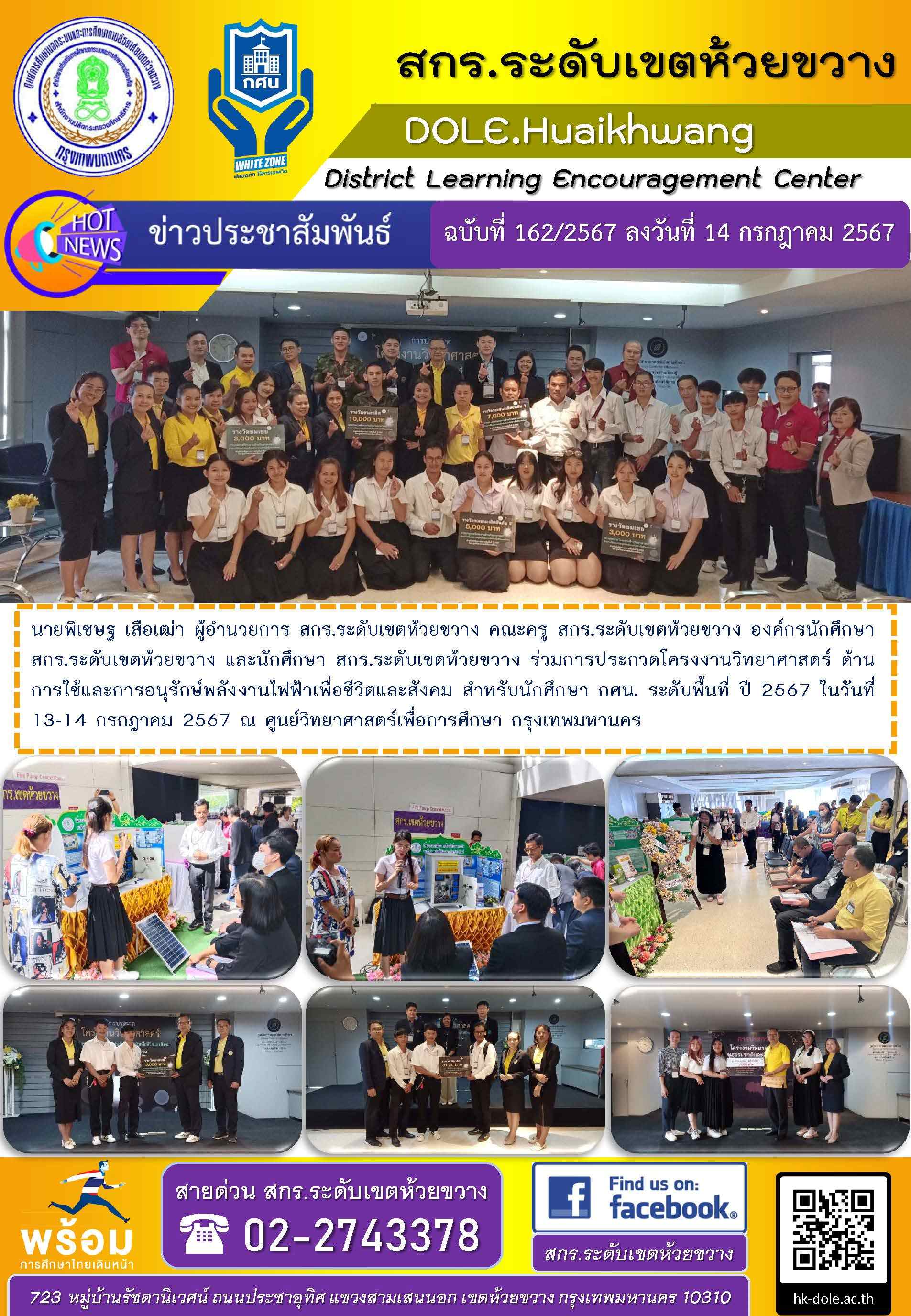 นายพิเชษฐ เสือเฒ่า ผู้อำนวยการ สกร.ระดับเขตห้วยขวาง คณะครู สกร.ระดับเขตห้วยขวาง องค์กรนักศึกษา สกร.ระดับเขตห้วยขวาง และนักศึกษา สกร.ระดับเขตห้วยขวาง ร่วมการประกวดโครงงานวิทยาศาสตร์ ด้านการใช้และการอนุรักษ์พลังงานไฟฟ้าเพื่อชีวิตและสังคม สำหรับนักศึกษา กศน. ระดับพื้นที่ ปี 2567 ในวันที่ 13-14 กรกฎาคม 2567 ณ ศูนย์วิทยาศาสตร์เพื่อการศึกษา กรุงเทพมหานคร