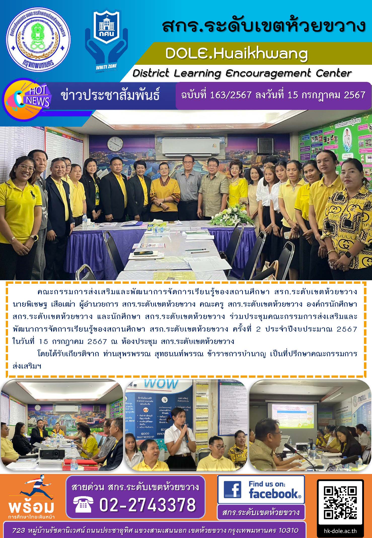 คณะกรรมการส่งเสริมและพัฒนาการจัดการเรียนรู้ของสถานศึกษา สรก.ระดับเขตห้วยขวาง นายพิเชษฐ เสือเฒ่า ผู้อำนวยการ สกร.ระดับเขตห้วยขวาง คณะครู สกร.ระดับเขตห้วยขวาง องค์กรนักศึกษา สกร.ระดับเขตห้วยขวาง และนักศึกษา สกร.ระดับเขตห้วยขวาง ร่วมประชุมคณะกรรมการส่งเสริมและพัฒนาการจัดการเรียนรู้ของสถานศึกษา สรก.ระดับเขตห้วยขวาง ครั้งที่ 2 ประจำปีงบประมาณ 2567 ในวันที่ 15 กรกฎาคม 2567 ณ ห้องประชุม สกร.ระดับเขตห้วยขวาง