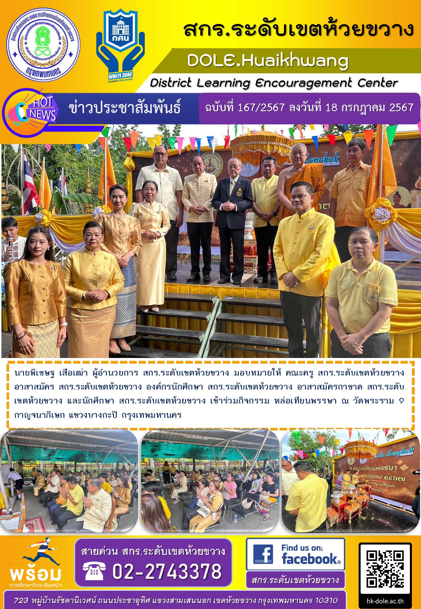 นายพิเชษฐ เสือเฒ่า ผู้อำนวยการ สกร.ระดับเขตห้วยขวาง มอบหมายให้ คณะครู สกร.ระดับเขตห้วยขวาง อาสาสมัคร สกร.ระดับเขตห้วยขวาง องค์กรนักศึกษา สกร.ระดับเขตห้วยขวาง อาสาสมัครกาชาด สกร.ระดับเขตห้วยขวาง และนักศึกษา สกร.ระดับเขตห้วยขวาง เข้าร่วมกิจกรรม หล่อเทียนพรรษา ณ วัดพระราม 9 กาญจนาภิเษก แขวงบางกะปิ กรุงเทพมหานคร