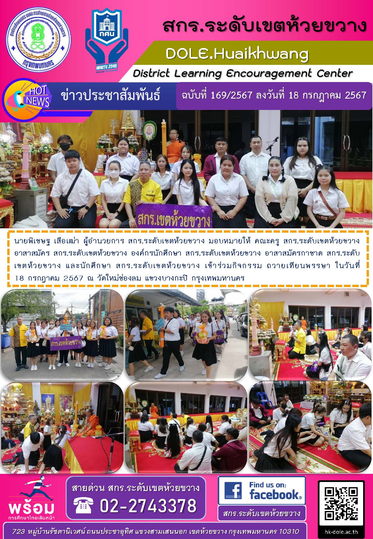 นายพิเชษฐ เสือเฒ่า ผู้อำนวยการ สกร.ระดับเขตห้วยขวาง มอบหมายให้ คณะครู สกร.ระดับเขตห้วยขวาง อาสาสมัคร สกร.ระดับเขตห้วยขวาง องค์กรนักศึกษา สกร.ระดับเขตห้วยขวาง อาสาสมัครกาชาด สกร.ระดับเขตห้วยขวาง และนักศึกษา สกร.ระดับเขตห้วยขวาง เข้าร่วมกิจกรรม ถวายเทียนพรรษา ในวันที่ 18 กรกฎาคม 2567 ณ วัดใหม่ช่องลม แขวงบางกะปิ กรุงเทพมหานคร