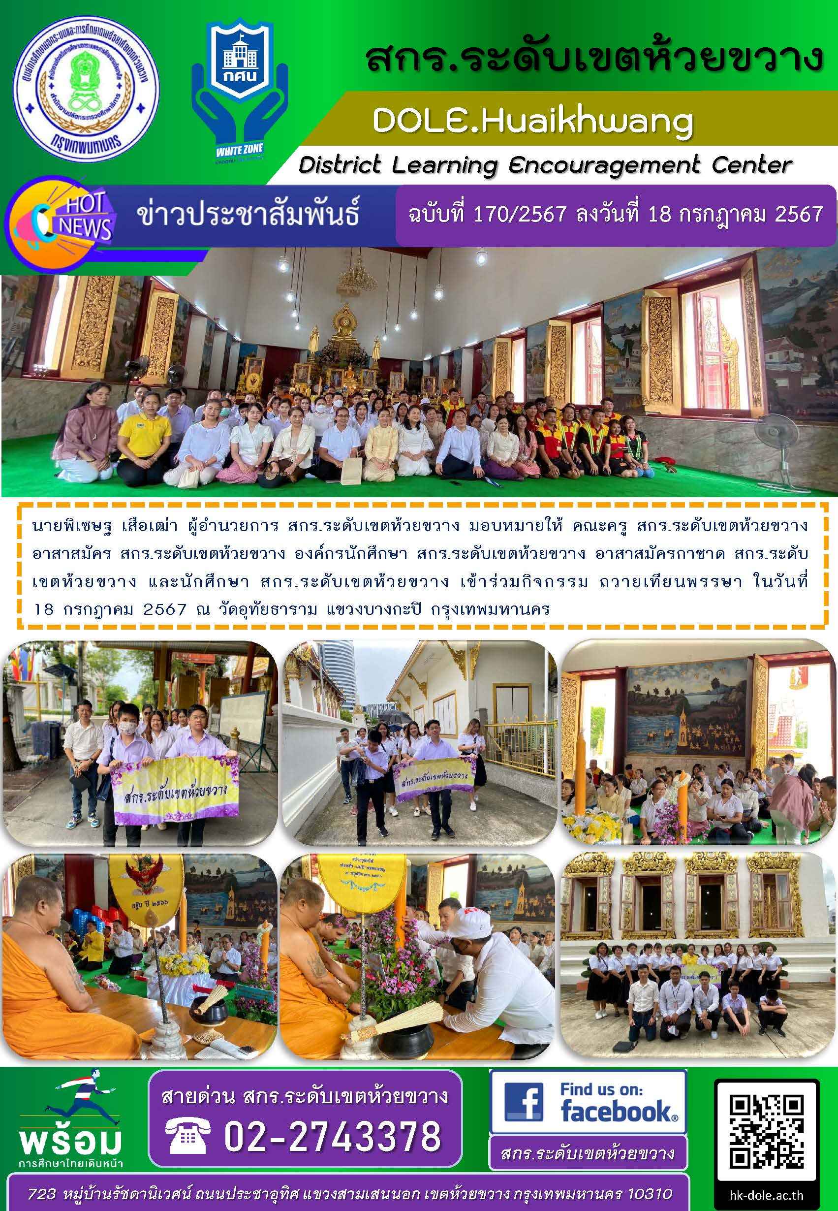 นายพิเชษฐ เสือเฒ่า ผู้อำนวยการ สกร.ระดับเขตห้วยขวาง มอบหมายให้ คณะครู สกร.ระดับเขตห้วยขวาง อาสาสมัคร สกร.ระดับเขตห้วยขวาง องค์กรนักศึกษา สกร.ระดับเขตห้วยขวาง อาสาสมัครกาชาด สกร.ระดับเขตห้วยขวาง และนักศึกษา สกร.ระดับเขตห้วยขวาง เข้าร่วมกิจกรรม ถวายเทียนพรรษา ในวันที่ 18 กรกฎาคม 2567 ณ วัดอุทัยธาราม แขวงบางกะปิ กรุงเทพมหานคร