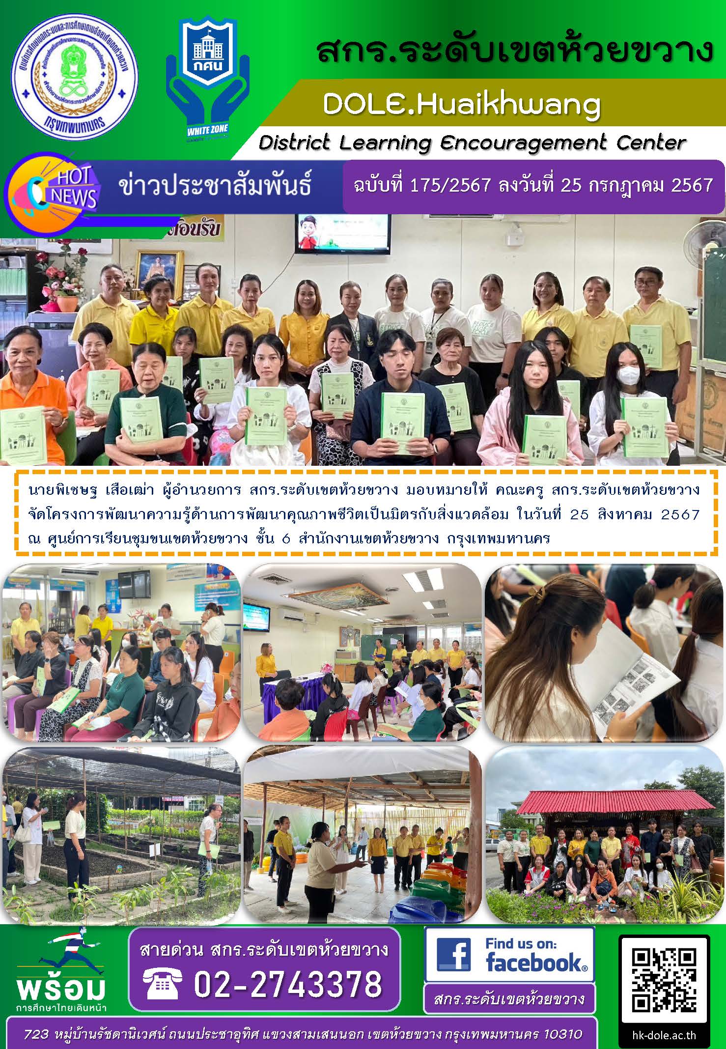 นายพิเชษฐ เสือเฒ่า ผู้อำนวยการ สกร.ระดับเขตห้วยขวาง มอบหมายให้ คณะครู สกร.ระดับเขตห้วยขวาง จัดโครงการพัฒนาความรู้ด้านการพัฒนาคุณภาพชีวิตเป็นมิตรกับสิ่งแวดล้อม ในวันที่ 25 กรกฎาคม 2567 ณ ศูนย์การเรียนชุมขนเขตห้วยขวาง ชั้น 6 สำนักงานเขตห้วยขวาง กรุงเทพมหานคร