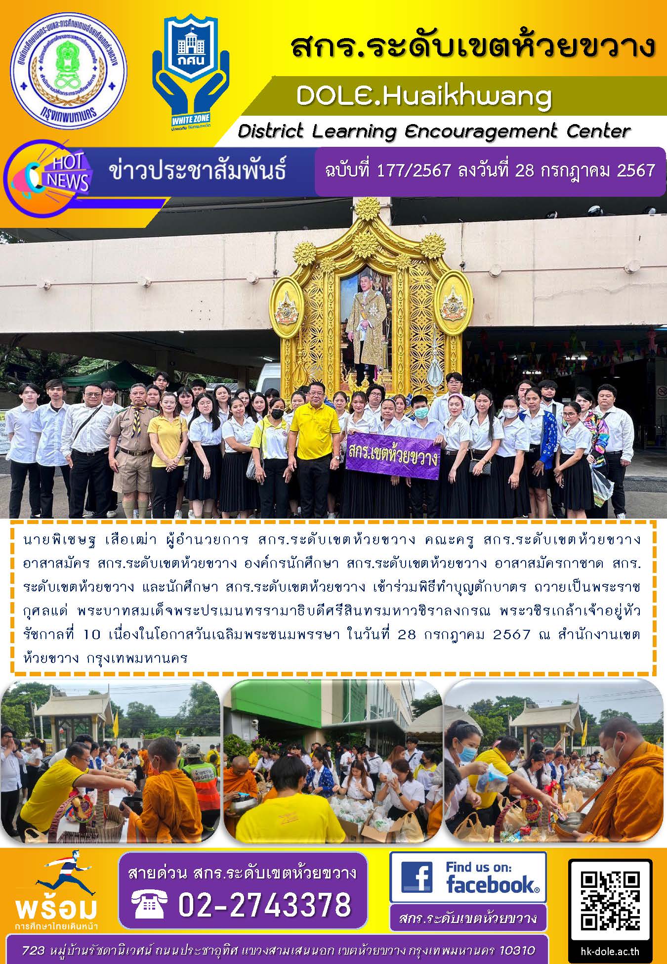 นายพิเชษฐ เสือเฒ่า ผู้อำนวยการ สกร.ระดับเขตห้วยขวาง คณะครู สกร.ระดับเขตห้วยขวาง อาสาสมัคร สกร.ระดับเขตห้วยขวาง องค์กรนักศึกษา สกร.ระดับเขตห้วยขวาง อาสาสมัครกาชาด สกร.ระดับเขตห้วยขวาง และนักศึกษา สกร.ระดับเขตห้วยขวาง เข้าร่วมพิธีทำบุญตักบาตร ถวายเป็นพระราชกุศลแด่ พระบาทสมเด็จพระปรเมนทรรามาธิบดีศรีสินทรมหาวชิราลงกรณ พระวชิรเกล้าเจ้าอยู่หัว รัชกาลที่ 10 เนื่องในโอกาสวันเฉลิมพระชนมพรรษา ในวันที่ 28 กรกฎาคม 2567 ณ สำนักงานเขตห้วยขวาง กรุงเทพมหานคร