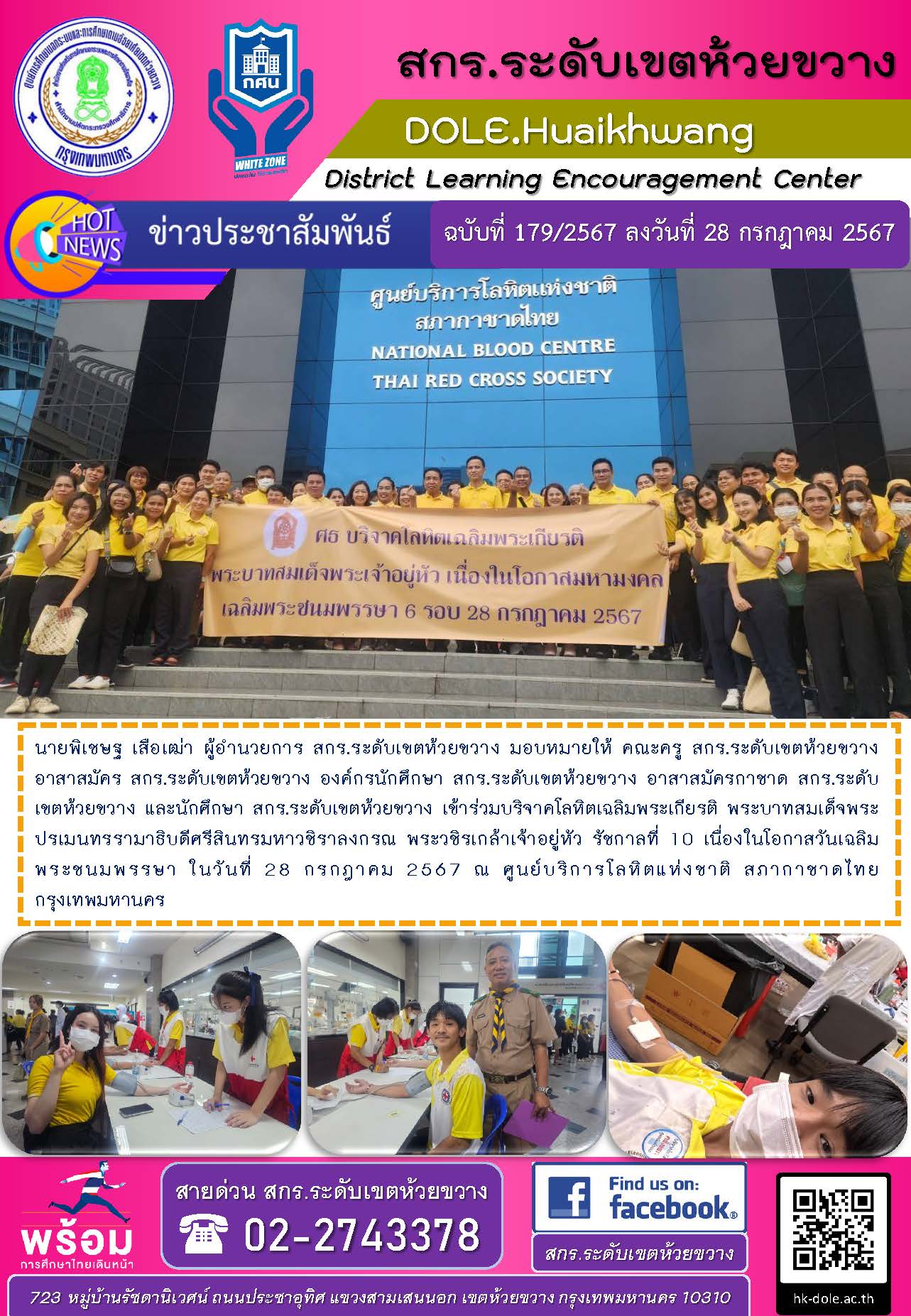 นายพิเชษฐ เสือเฒ่า ผู้อำนวยการ สกร.ระดับเขตห้วยขวาง มอบหมายให้ คณะครู สกร.ระดับเขตห้วยขวาง อาสาสมัคร สกร.ระดับเขตห้วยขวาง องค์กรนักศึกษา สกร.ระดับเขตห้วยขวาง อาสาสมัครกาชาด สกร.ระดับเขตห้วยขวาง และนักศึกษา สกร.ระดับเขตห้วยขวาง เข้าร่วมบริจาคโลหิตเฉลิมพระเกียรติ พระบาทสมเด็จพระปรเมนทรรามาธิบดีศรีสินทรมหาวชิราลงกรณ พระวชิรเกล้าเจ้าอยู่หัว รัชกาลที่ 10 เนื่องในโอกาสวันเฉลิมพระชนมพรรษา ในวันที่ 28 กรกฎาคม 2567 ณ ศูนย์บริการโลหิตแห่งชาติ สภากาชาดไทย กรุงเทพมหานคร