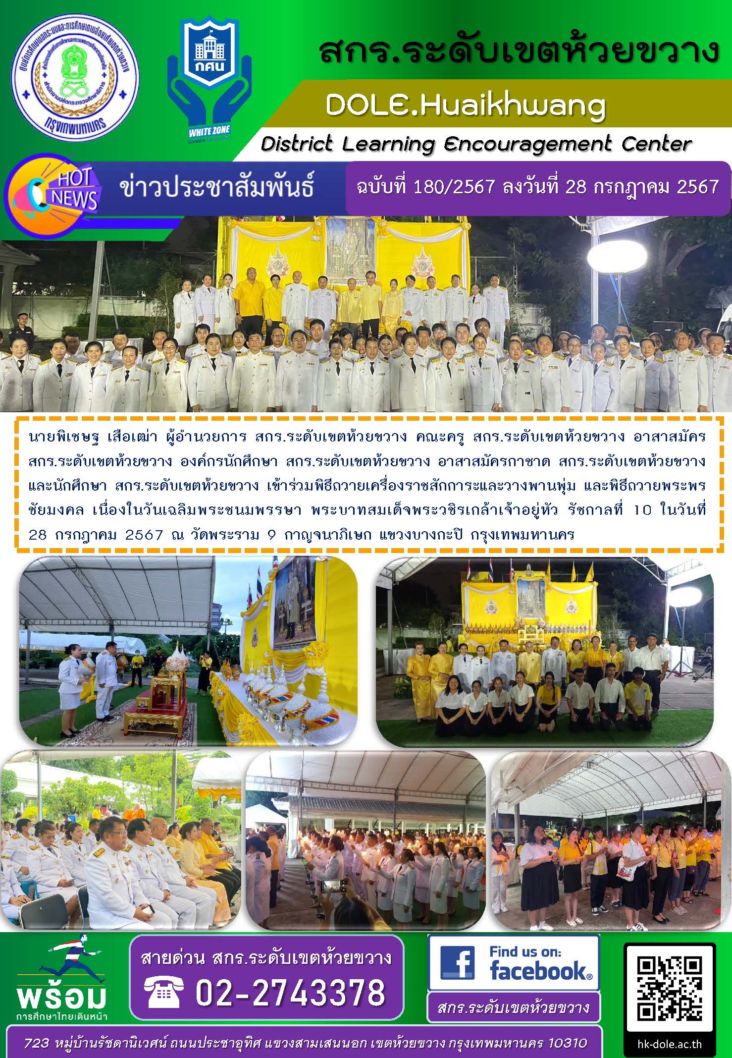 นายพิเชษฐ เสือเฒ่า ผู้อำนวยการ สกร.ระดับเขตห้วยขวาง คณะครู สกร.ระดับเขตห้วยขวาง อาสาสมัคร สกร.ระดับเขตห้วยขวาง องค์กรนักศึกษา สกร.ระดับเขตห้วยขวาง อาสาสมัครกาชาด สกร.ระดับเขตห้วยขวาง และนักศึกษา สกร.ระดับเขตห้วยขวาง เข้าร่วมพิธีถวายเครื่องราชสักการะและวางพานพุ่ม และพิธีถวายพระพรชัยมงคล เนื่องในวันเฉลิมพระชนมพรรษา พระบาทสมเด็จพระวชิรเกล้าเจ้าอยู่หัว รัชกาลที่ 10 ในวันที่ 28 กรกฎาคม 2567 ณ วัดพระราม 9 กาญจนาภิเษก แขวงบางกะปิ กรุงเทพมหานคร