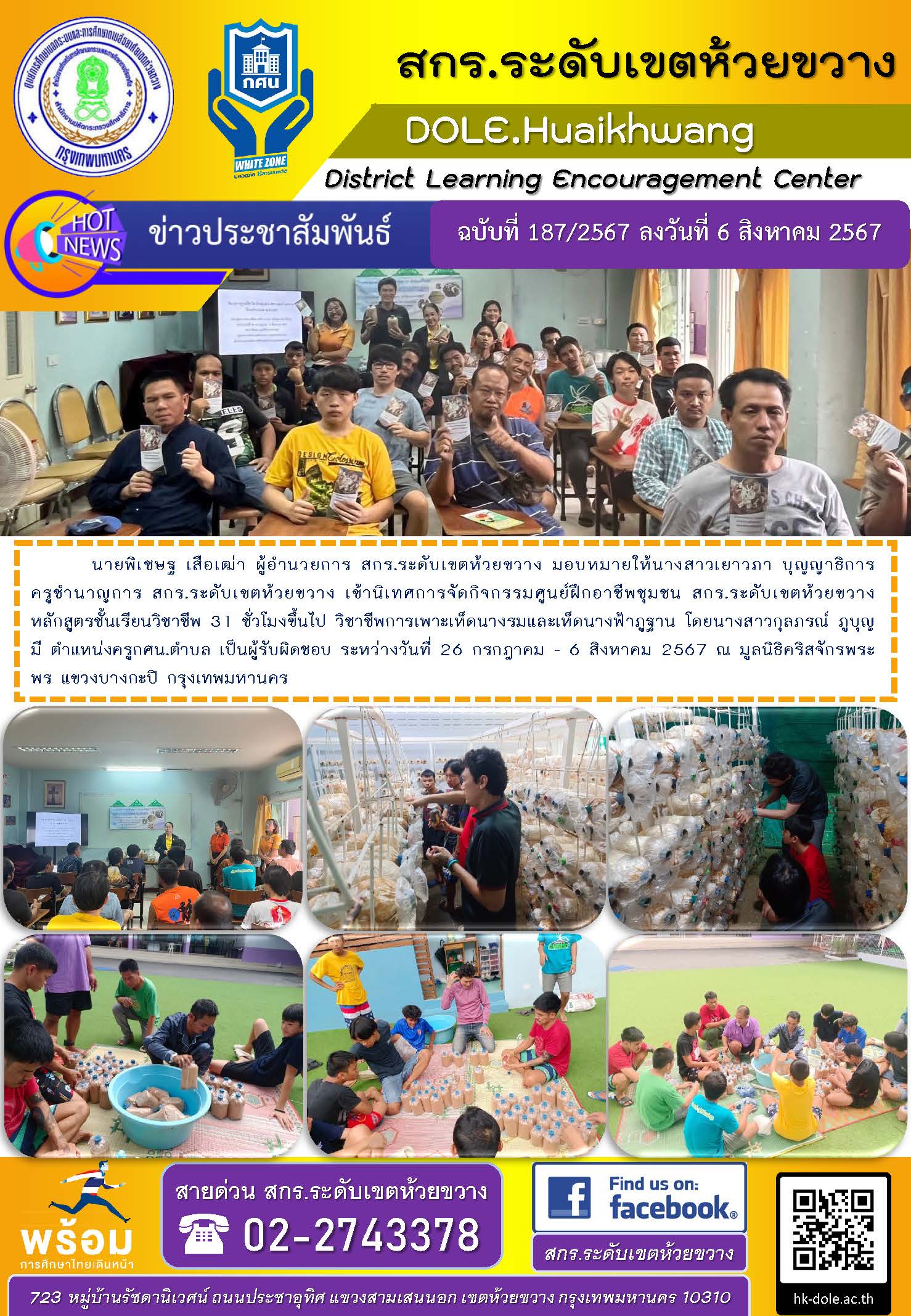 นายพิเชษฐ เสือเฒ่า ผู้อำนวยการ สกร.ระดับเขตห้วยขวาง มอบหมายให้นางสาวเยาวภา บุญญาธิการ ครูชำนาญการ สกร.ระดับเขตห้วยขวาง เข้านิเทศการจัดกิจกรรมศูนย์ฝึกอาชีพชุมชน สกร.ระดับเขตห้วยขวาง หลักสูตรชั้นเรียนวิชาชีพ 31 ชั่วโมงขึ้นไป วิชาชีพการเพาะเห็ดนางรมและเห็ดนางฟ้าภูฐาน โดยนางสาวกุลภรณ์ ภูบุญมี ตำแหน่งครูกศน.ตำบล เป็นผู้รับผิดชอบ ระหว่างวันที่ 26 กรกฎาคม - 6 สิงหาคม 2567 ณ มูลนิธิคริสจักรพระพร แขวงบางกะปิ กรุงเทพมหานคร