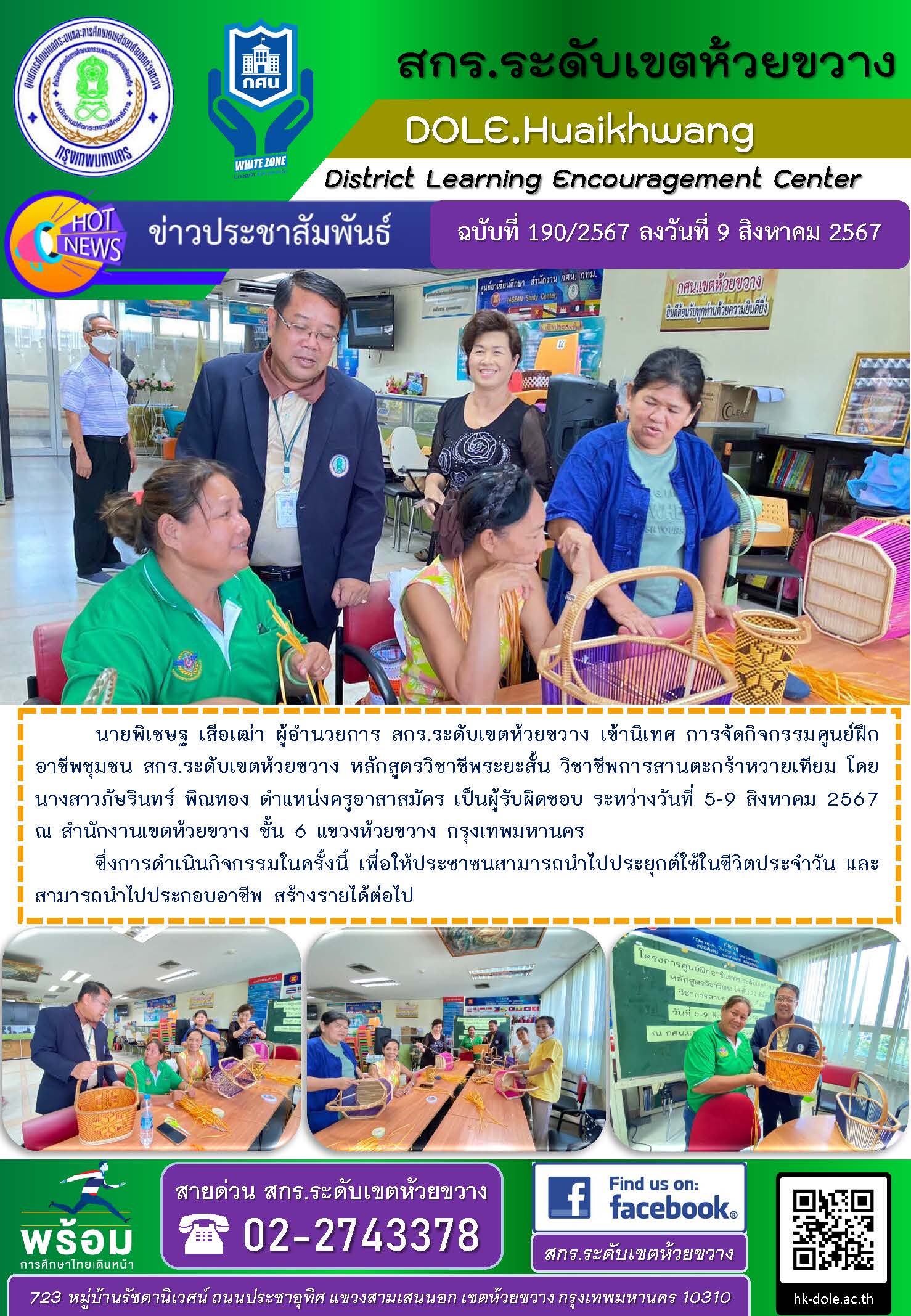 นายพิเชษฐ เสือเฒ่า ผู้อำนวยการ สกร.ระดับเขตห้วยขวาง เข้านิเทศ การจัดกิจกรรมศูนย์ฝึกอาชีพชุมชน สกร.ระดับเขตห้วยขวาง หลักสูตรวิชาชีพระยะสั้น วิชาชีพการสานตะกร้าหวายเทียม โดยนางสาวภัษรินทร์ พิณทอง ตำแหน่งครูอาสาสมัคร เป็นผู้รับผิดชอบ ระหว่างวันที่ 5-9 สิงหาคม 2567 ณ สำนักงานเขตห้วยขวาง ชั้น 6 แขวงห้วยขวาง กรุงเทพมหานคร